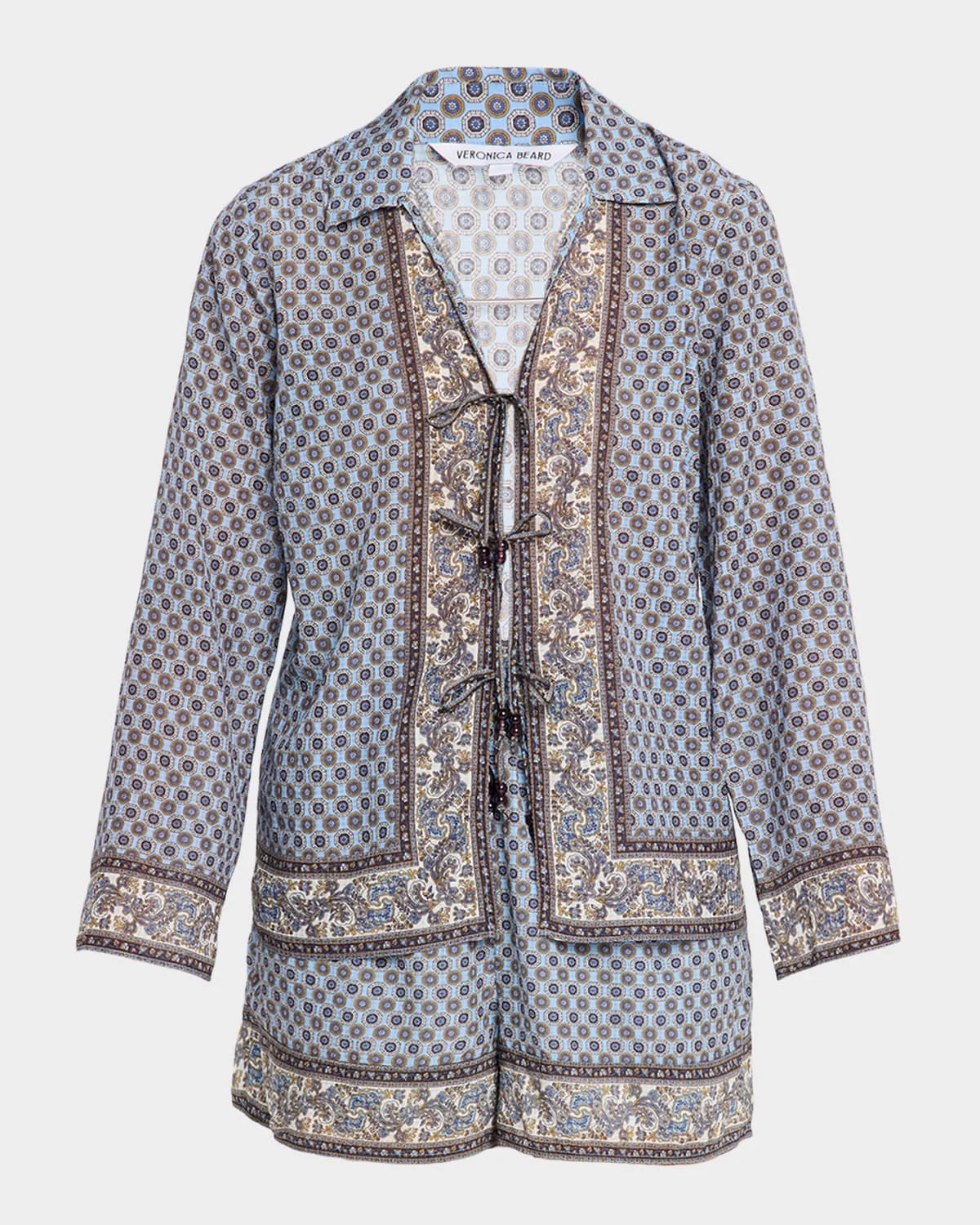 Made from lightweight, breathable stretch cotton, Veronica Beard & apos;s "Eva" blouse features a graphic, scarf-inspired print & nbsp; Collared V neckline Long sleeves Relaxed fit Hip length Self-tie front closure Viscose/cotton Dry clean Imported SIZE & FITModel measurements: 5 & apos;10" tallModel is wearing a US size 4/Small