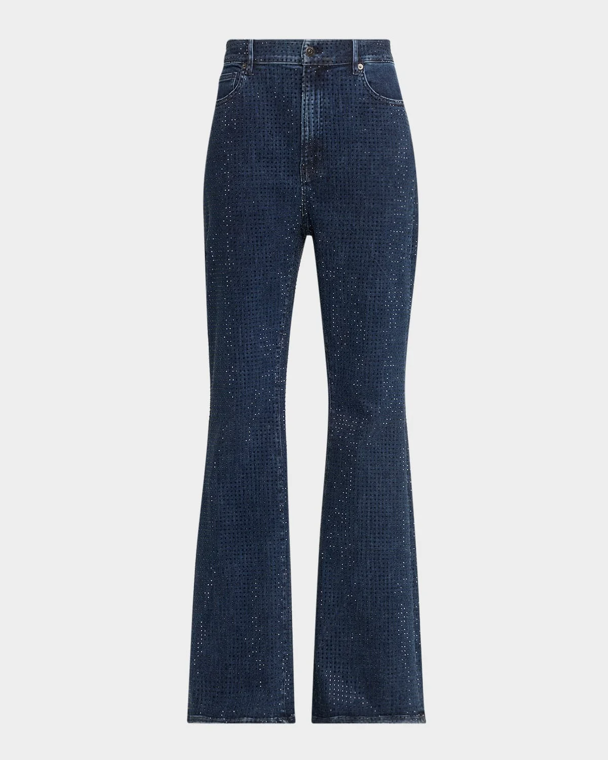 - Exclusively ours. - Veronica Beard "Beverly" rhinestone-embellished flare jeans in dark-wash stretch denim - Approx. 11" rise; 34" inseam - High rise - Five-pocket style - Fitted through the hip and thigh - Full length - Button/zip fly; belt loops - Cotton/polyester/spandex - Machine wash inside out - Imported