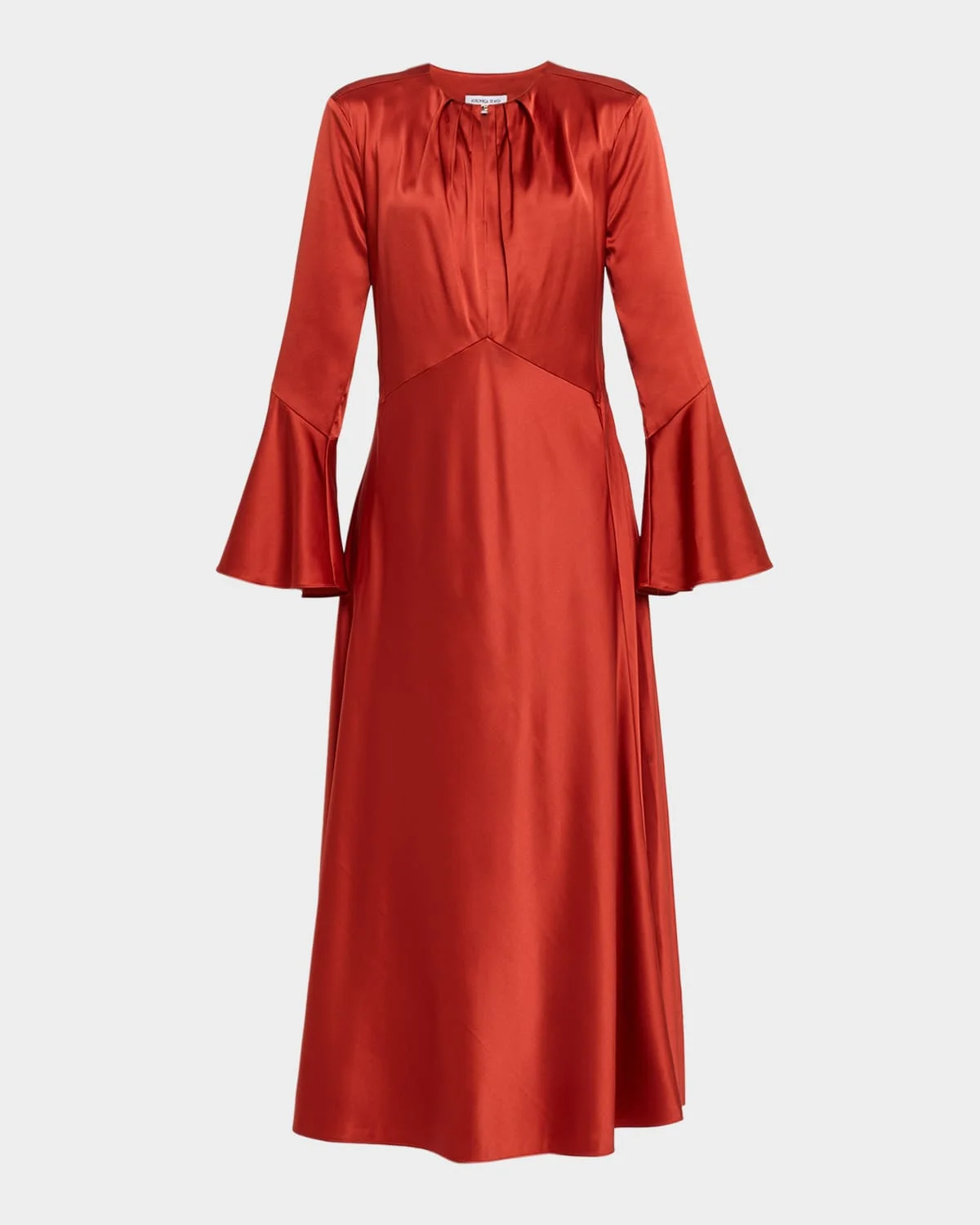 Cut from sleek silkblend satin, the "Ezri" dress by Veronica Beard features a biascut silhouette with a Vshaped waist seam Approx. 52.8"L from shoulder to hem Crew neckline with optional selfties Long circlecut sleeves; approx. 32.3"L Hem falls below the knee Aline silhouette Silk/viscose/elastane Lining: Polyester Dry clean Imported