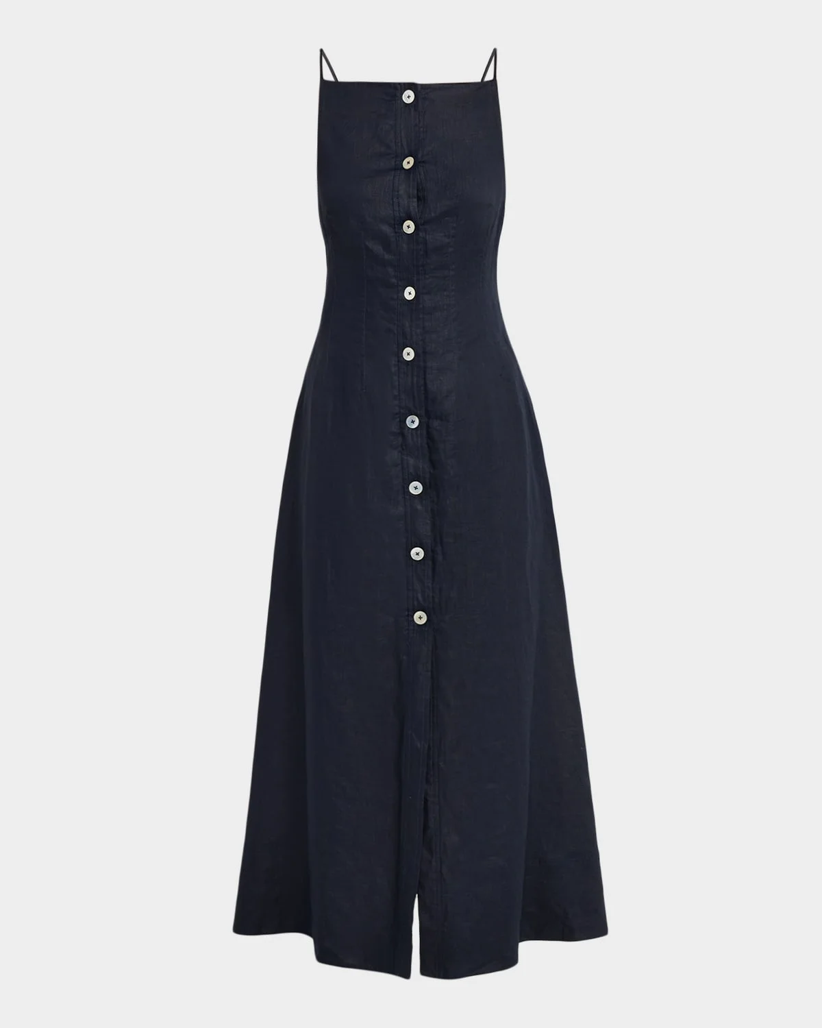 Veronica Beard "Georges" midi dress tailored from breathable linen and finished with a refined button-front & nbsp; Square neckline Sleeveless A-line silhouette Hem falls below the knee & nbsp; Invisible side zip & nbsp; Linen Dry clean only & nbsp; Imported SIZE & FITModel measurements: 5 & apos;10" tallModel is wearing a US size 4/Small