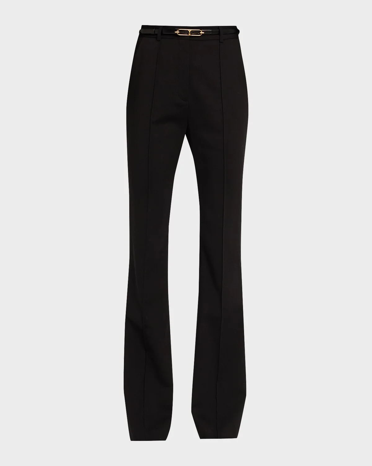 Tailored in stretch wool, the "Gracie" pants by Veronica Beard are adorned with a pintuck front and a removable belt with a polished gold buckle for versatile styling. Approx. 11.6" rise; 34" inseam High rise Side slash pockets; back welt pockets Slim, flared legs Full length Hook/zip fly; belt loops Virgin wool/elastane Dry clean only Imported