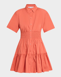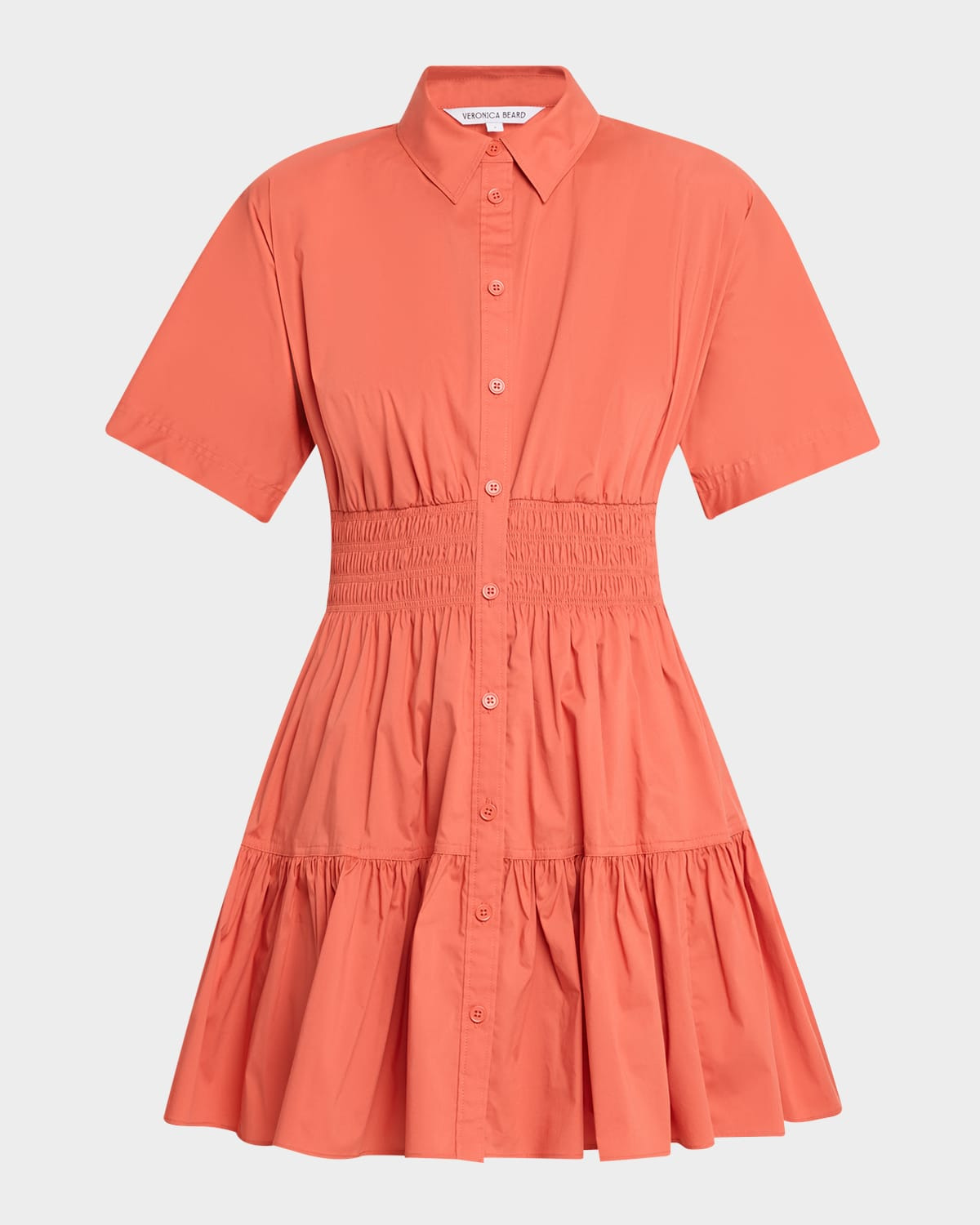 - Veronica Beard "Greta" crisp cotton mini dress with a ruched waist - Point collar - Cap sleeves - Shirtdress silhouette - Hem falls above the knee - Button-front - Cotton - Dry clean - Imported
