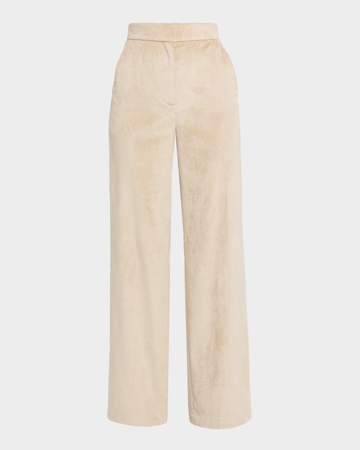 - The "Grigore" pants by Veronica Beard are crafted in corduroy for a comfortable and sophisticated fall closet staple. - Approx. 11.8" rise; 32" inseam - High rise; back elastic waistband - Four-pocket style - Wide legs - Full length - Hook/zip fly - Cotton/viscose/elastane - Unlined - Dry clean - Made in Portugal