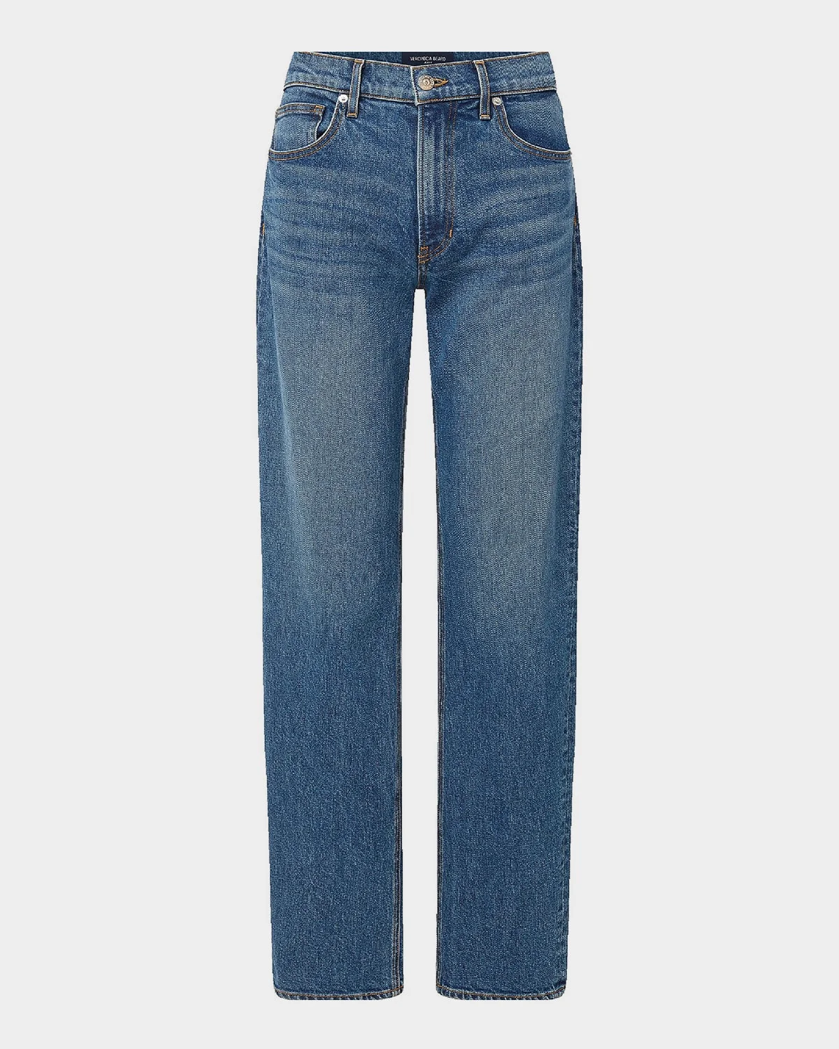 Veronica Beard "Harley" jeans crafted from premium denim with a moderninspired bowed leg. Approx. 11.5" rise; 29.5" inseam High rise Fivepocket style Relaxed, tapered fit Full length Button/zip fly; belt loops Cotton/elastane Machine wash cold, inside out Made in USA from imported materials