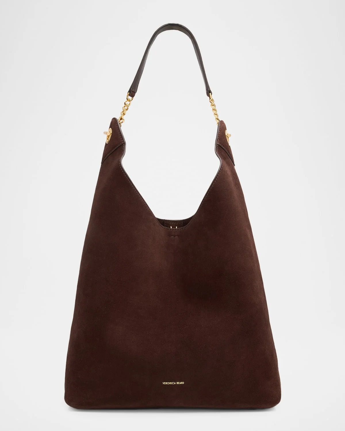 Crafted of suede, this Veronica Beard "Jour" shoulder bag features a soft and slouchy northsouth silhouette with a roomy interior Detachable chain/leather shoulder strap, 12.6" drop Open top with internal loop closure Interior, one slip pocket Approx. 12.2"H x 13.4"W x 3.5"D Professional cleaning recommended Imported