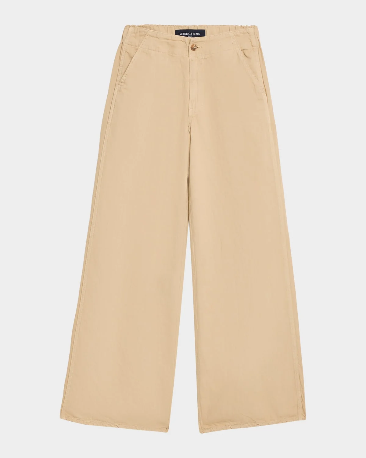 Veronica Beard "Kasey" wide-leg pants cut from crisp cotton-twill & nbsp; Approx. 11" rise; 32.5" inseam & nbsp; Mid-rise; sits high on the hip Back elastic waistband & nbsp; Side slip pockets; back patch pockets Relaxed fit & nbsp; Full length Button/zip fly & nbsp; Cotton/Tencel® lyocell/linen Machine wash cold, inside out Imported SIZE & FITModel measurements: 5 & apos;10" tallModel is wearing a US size 4/Small