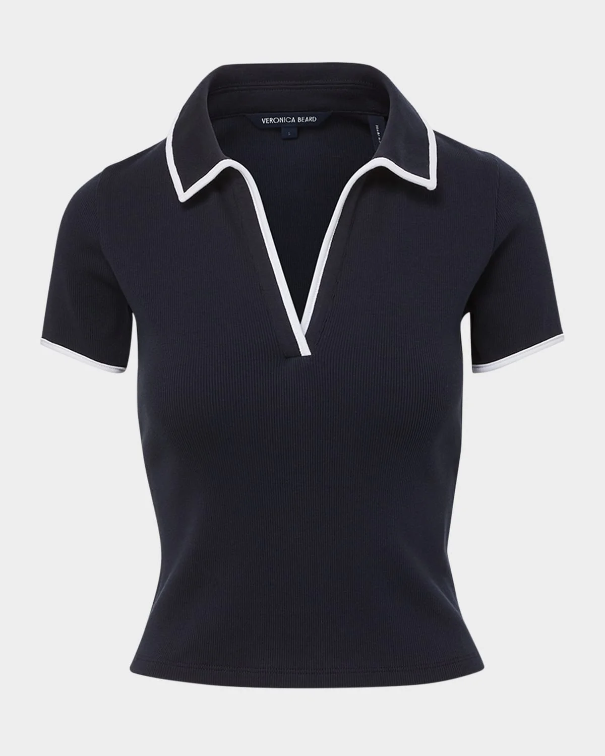 - Veronica Beard "Kearney" ribbed button-front polo tee - Point collar; V neckline - Short sleeves; approx. 14.3"L - Cropped fit - Hem sits at the hip - Pullover style - Cotton - Machine wash cold - Imported