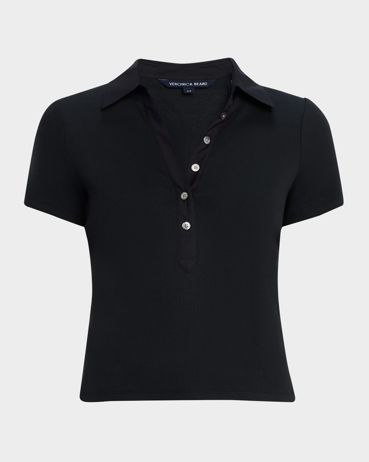 - Veronica Beard "Kearney" ribbed button-front polo tee - Point collar; V neckline - Short sleeves; approx. 14.3"L - Cropped fit - Hem sits at the hip - Pullover style - Cotton - Machine wash cold - Imported