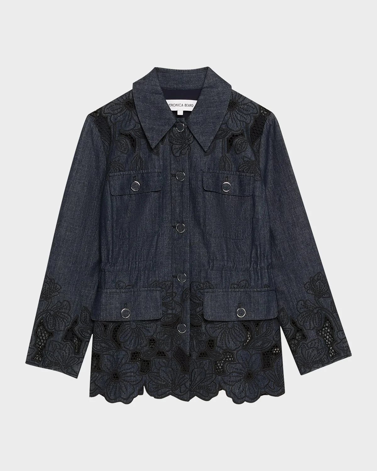 Crafted from premium cotton chambray, the "Kiki" jacket by Veronica Beard is adorned with intricate lace embroidery, creating an eye-catching, feminine silhouette. Point collar Single-breasted front Long sleeves Dual chest and hip pockets Classic fit Hem falls to & nbsp;the hip Button-front & nbsp; Cotton Dry clean Imported