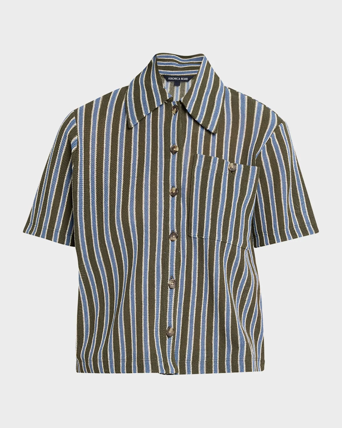 Crafted from cotton, Veronica Beard & apos;s "Kyan" cardigan is detailed with bold vertical striping Spread collar Short sleeves Buttoned chest patch pocket Hip length Button front closure Cotton Imported SIZE & FITModel measurements: 5 & apos;10" tallModel is wearing a US size 4/Small