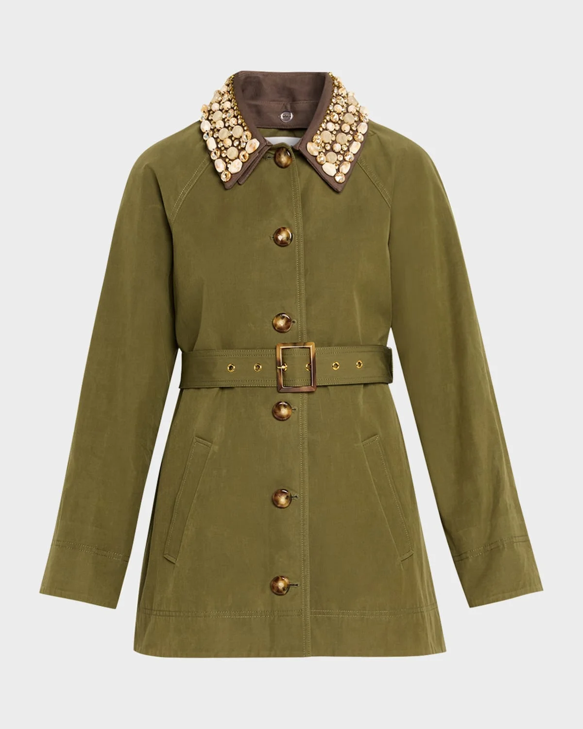 Veronica Beard "Langham" water-resistant dickey coat adorned with removable bead-embellished collar for versatile styling Compatible with Veronica Beard dickey & apos;s (sold separately) Point collar Long raglan sleeves with button cuffs Removable belt & nbsp; Angled welt pockets Classic fit Hem falls to the hip Button-front & nbsp; Cotton/polyester/nylon/polyamide Dry clean Imported