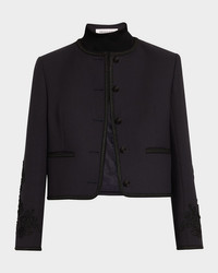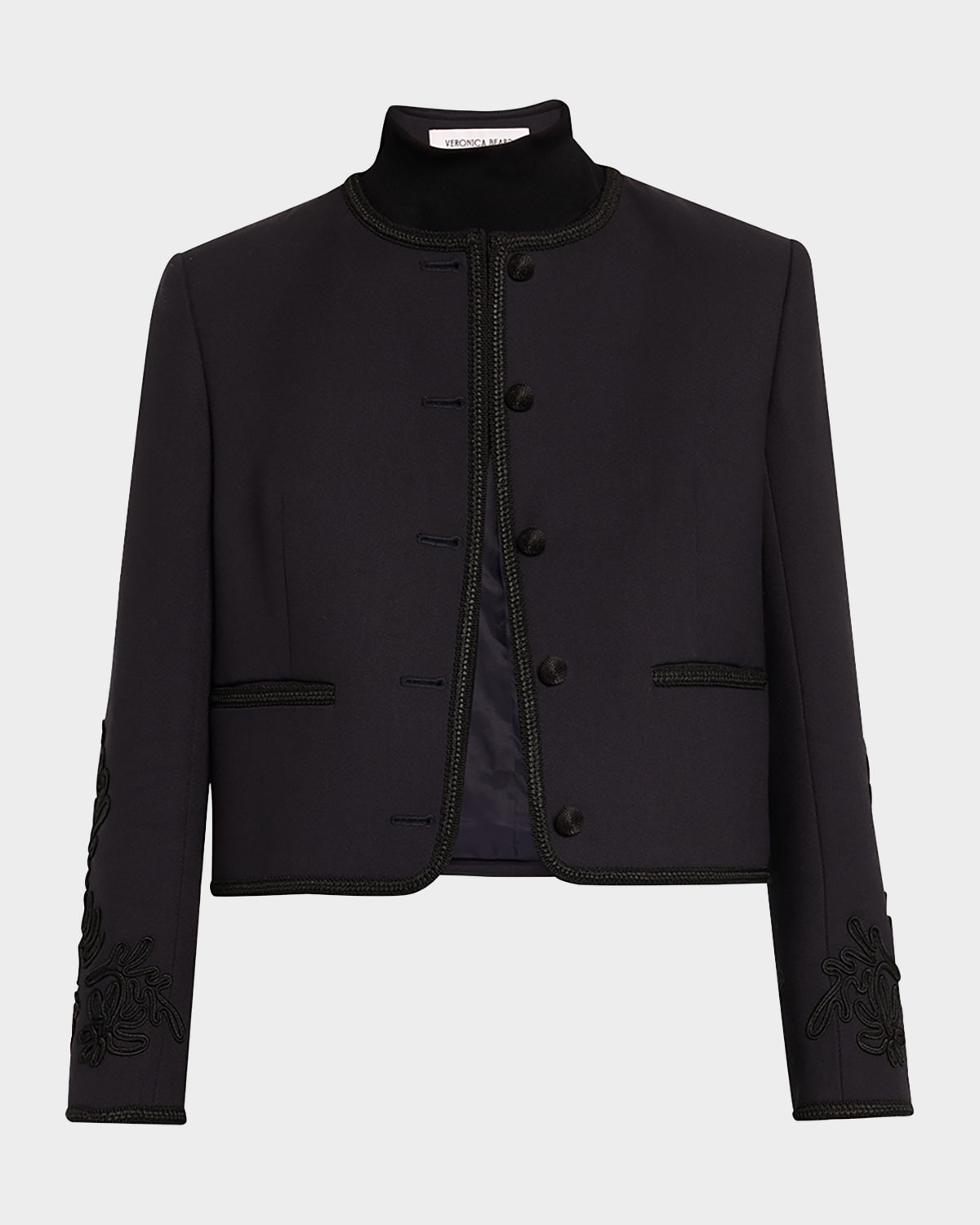 Adorned with looped braided trim, covered buttons, and intricate embroidery, the "Latrell" jacket by Veronica Beard offers a structured silhouette with rich texture and dimension Approx. 20"L from shoulder to hem Collarless neckline Long sleeves with button cuffs; approx. 11.1"L Hip welt pockets Classic fit Hip length Button front closure Viscose/acrylic/polyester Lining: Viscose Dry clean Imported