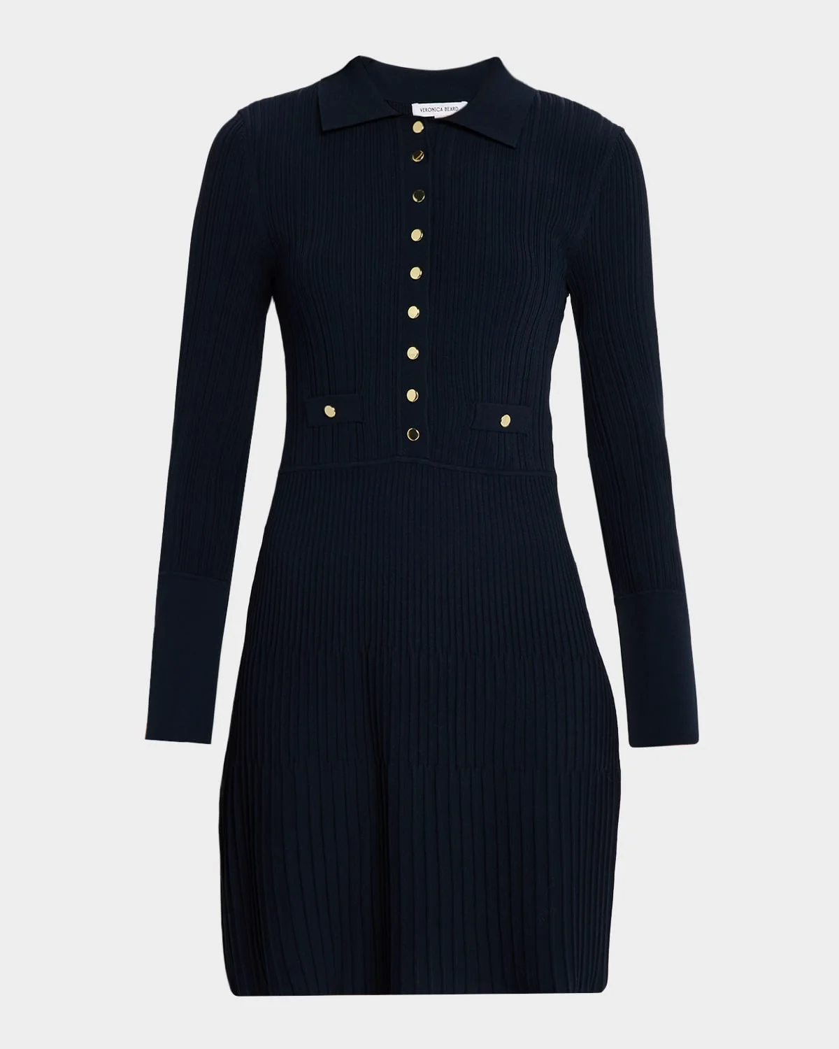 Crafted in ribbed stretchknit, the "Lauper" mini dress by Veronica Beard offers a comfortable, fitted silhouette finished with goldtone snaps for a polished look. Spread collar; snapplacket Long sleeves with elongated button cuffs Faux pockets Shirtdress silhouette Hem falls above the knee Slipover style Viscose/nylon/polyamide/polyester Dry clean only Imported