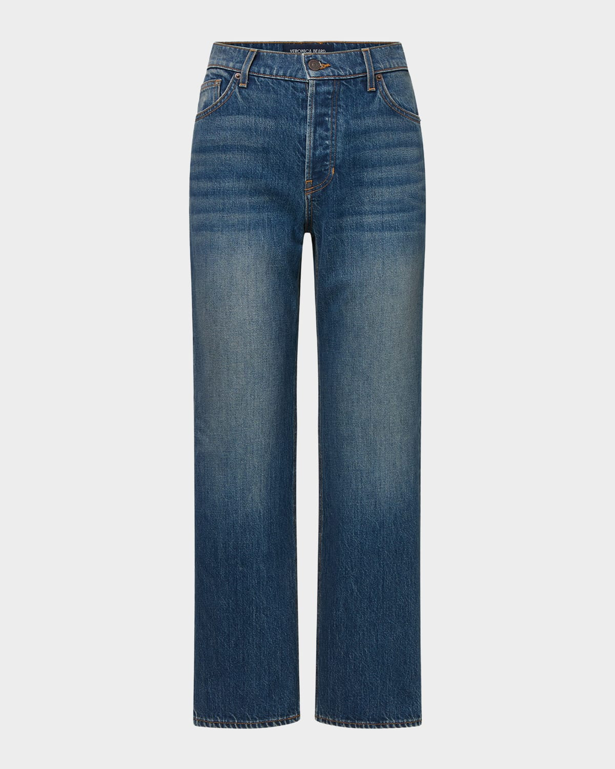 - Expertly crafted from medium wash Italian stretch denim, the "Leah" jeans by Veronica Beard offer a flattering, snug fit through the hip and thigh - Approx. 11" rise; 29" inseam - Mid-rise sits high on hip - Five-pocket style - Ankle-length hem - Straight legs - Button/zip fly; belt loops - Cotton/elastane - Made in USA