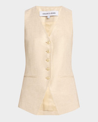 - Veronica Beard "Liff" linen vest featuring a metallic sheen - V neckline - Sleeveless - Adjustable back strap - Hip welt pockets - Tailored fit - Cut-away hem - Button-front - Linen - Dry clean - Imported