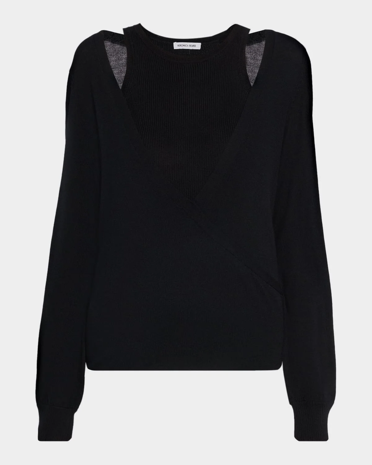 An effortless layered look, the "Lolasee" top by Veronica Beard is designed as two pieces in one: a Vneck sweater layered over a ribbed tank top Crew neckline Subtle shoulderrevealing detail Long sleeves Hip length Pullover style Merino wool Dry clean Imported