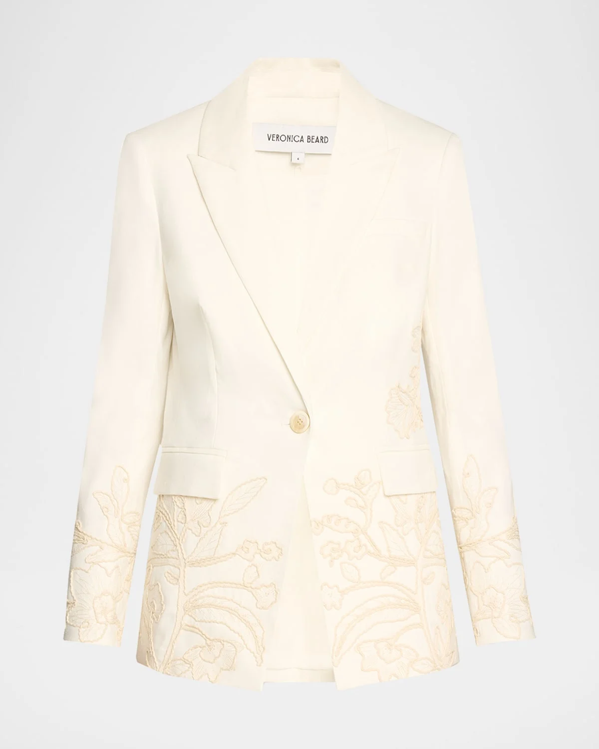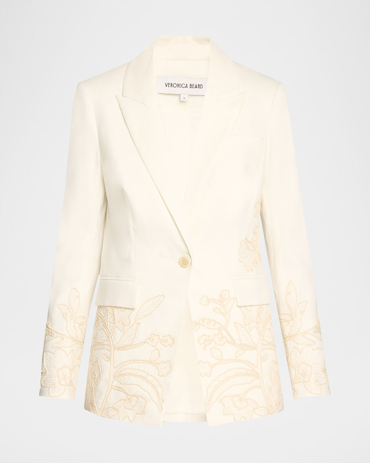 - Veronica Beard "Long and Lean" embroidered dickey jacket - Compatible with Veronica Beard dickey's (sold separately) - Peak lapels - Single-breasted front - Long sleeves with button cuffs - Chest welt pocket - Hip flap pockets - Tailored fit - Cut-away hem - Single button-front - Linen - Dry clean - Imported