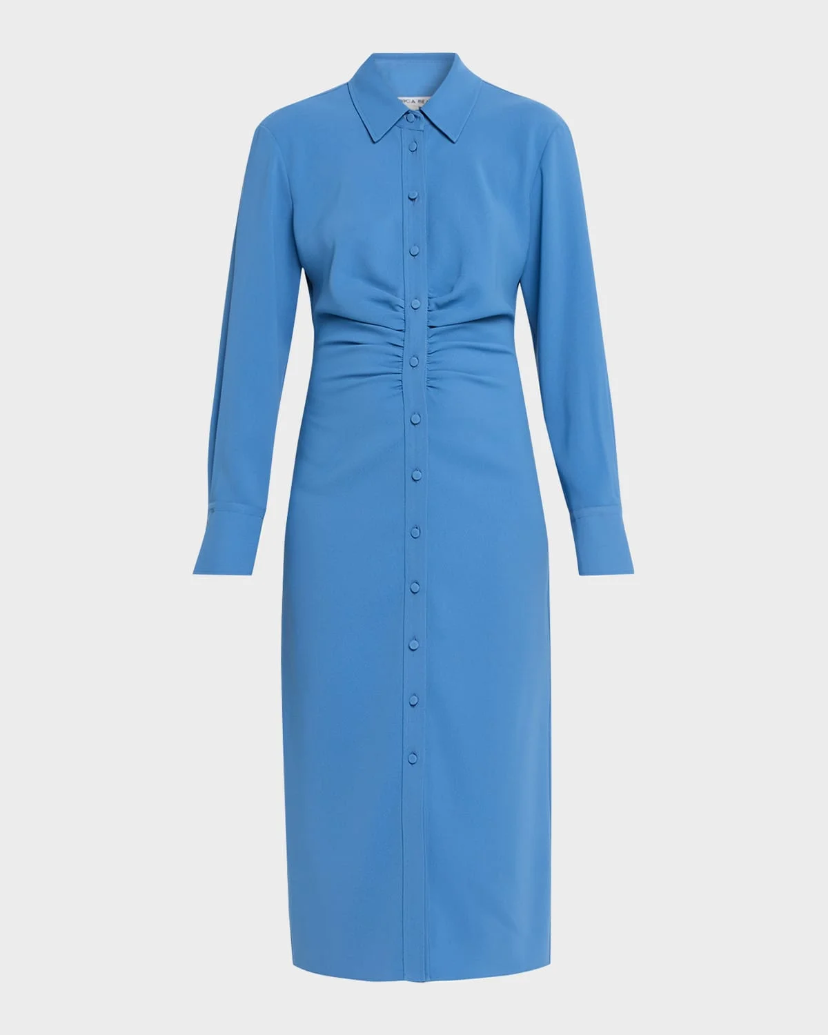 Crafted from lightweight stretch-crepe, the "Loxley" midi dress by Veronica Beard boasts a modern take on the classic shirtdress with front ruching. Point collar Long sleeves with button cuffs Shirtdress silhouette Hem falls below the knee Button-front & nbsp; Polyester/elastane Dry clean Imported