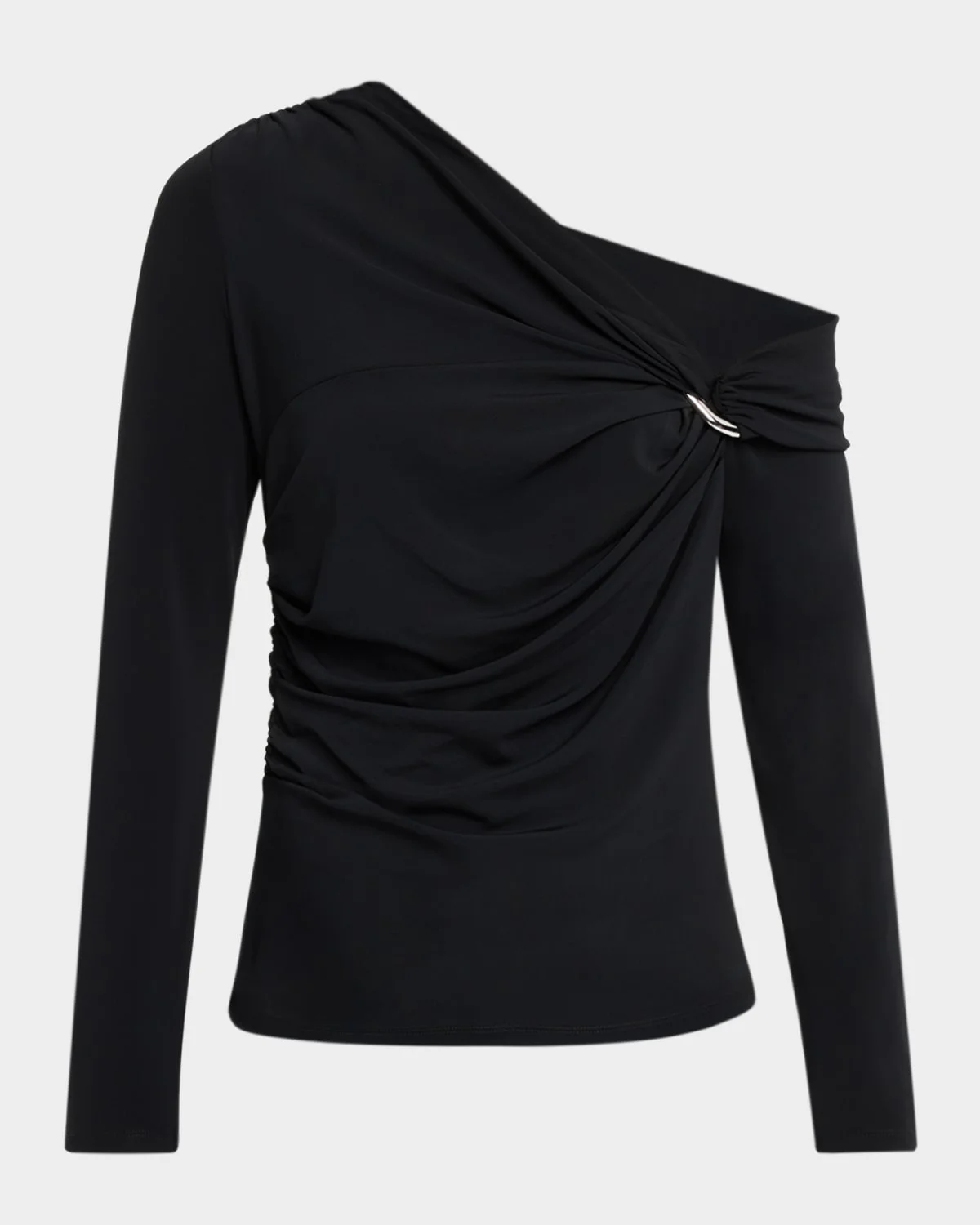 Crafted from stretch jersey, the "Lozea" top by Veronica Beard is designed with intricate draping and a silvertone ring detail at the shoulder. Oneshoulder neckline Long sleeves Slim fit Hem sits at the hip Pullover style Viscose/elastane Dry clean Imported