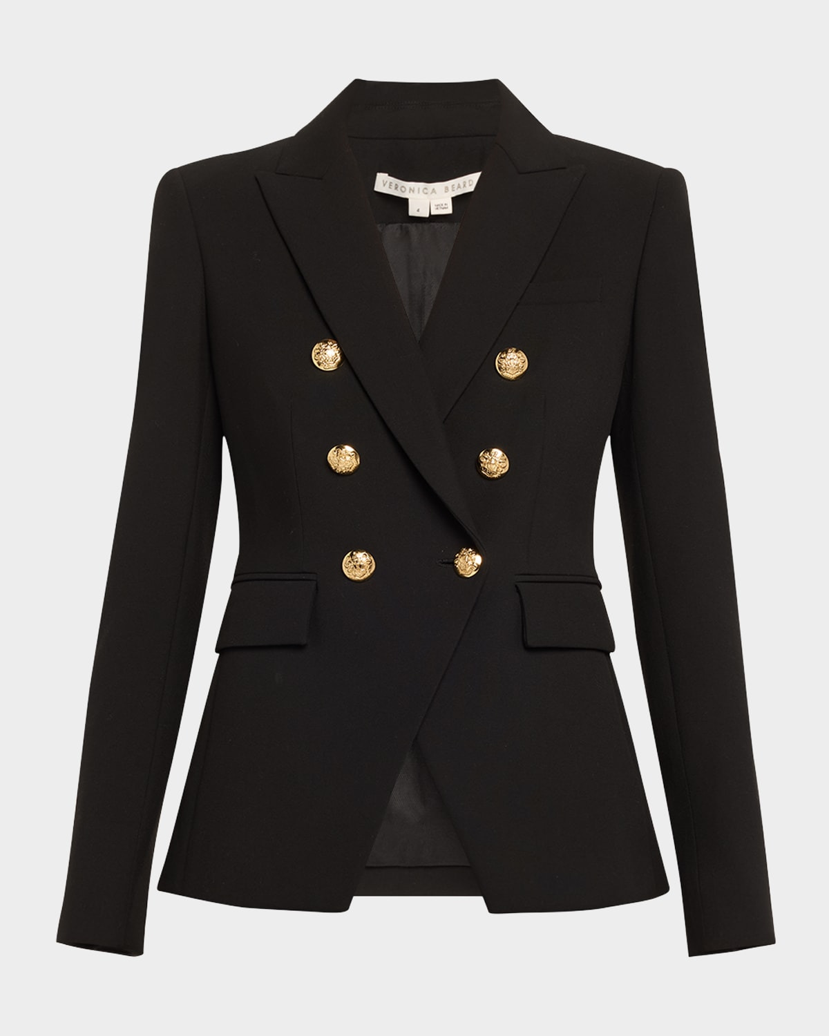 Veronica Beard "Miller" dickey jacket. Approx. measurements: Sleeve length 32 3/4"; Length 26" Compatible with all Veronica Beard dickeys (sold separately). Peak lapels; doublebreasted front. Long sleeves; button cuffs. Chest welt pocket. Side flap pockets. Tailored fit. Vented back. Polyester. Professional dry clean only Made in the USA