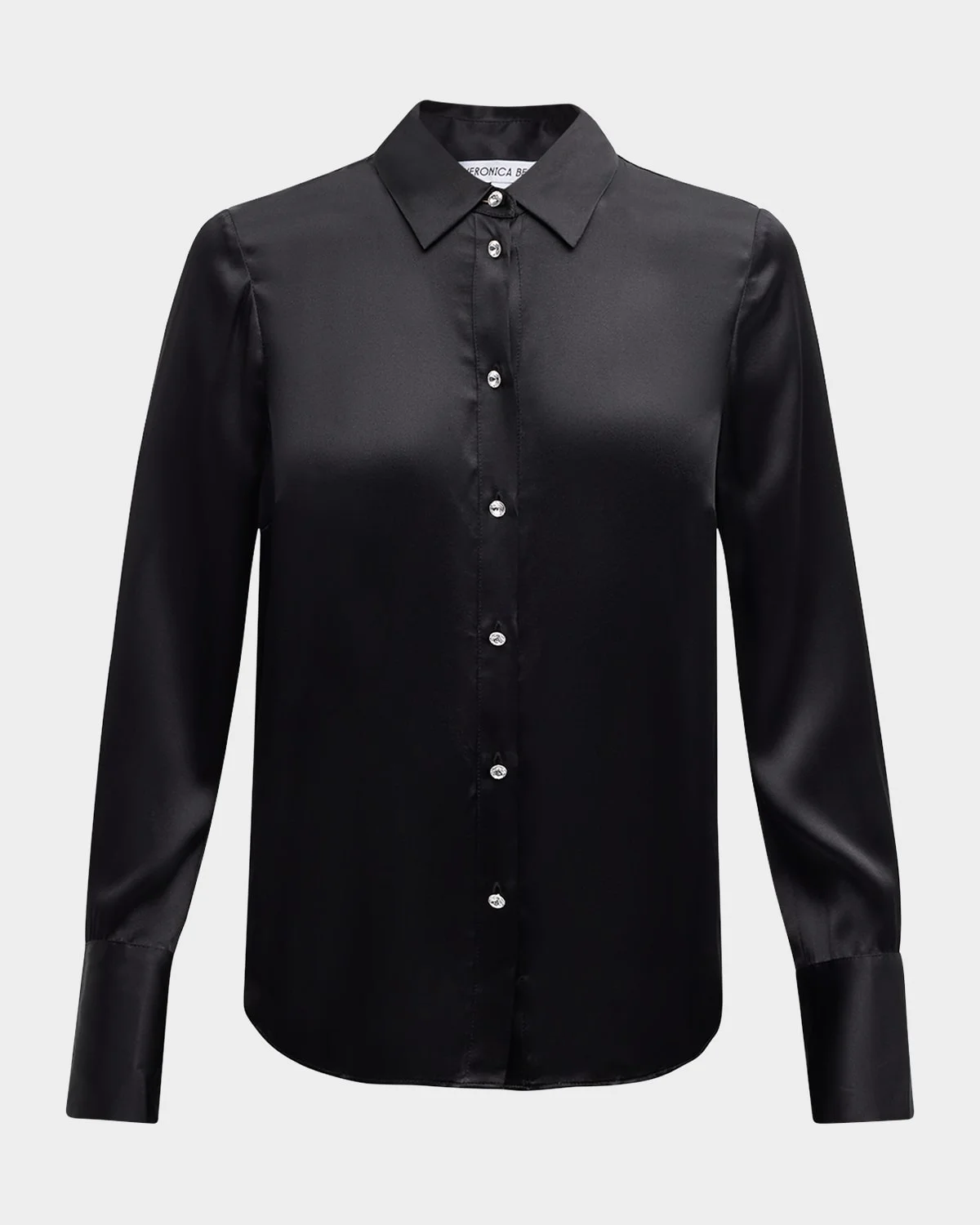 Veronica Beard "Monique" satin top finished with rhinestone buttons Point collar Long sleeves with button cuffs; approx. 32.3"L Classic fit Hem falls to the hip Buttonfront Polyester Lining: Polyester Dry clean Imported