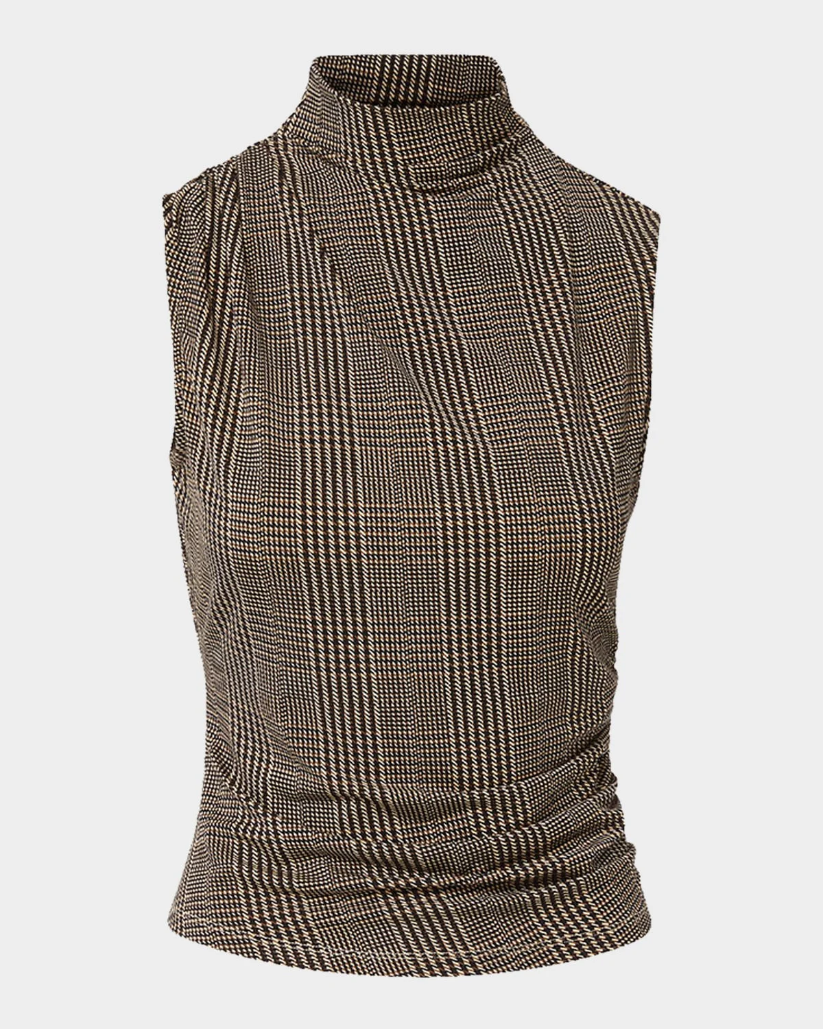 Veronica Beard "Mylie" ruched jersey top in Prince of Wales plaid Mock neckline Sleeveless Easy fit Hem sits at the hip Pullover style Lyocell/elastane Machine wash inside out Imported