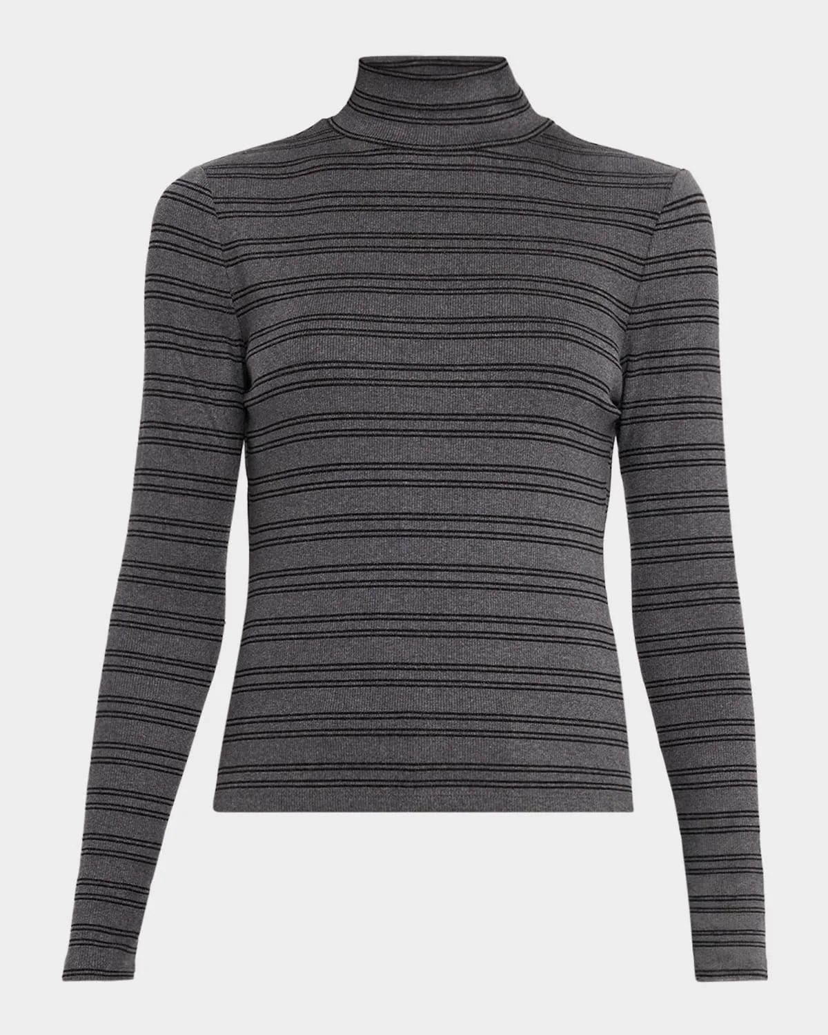 Patterned with classic stripes on a ribbed cottonblend base, the "Nate" top by Veronica Beard offers a versatile silhouette that can be worn on its own or as a base layer Mock neckline Long sleeves Slim fit Hip length Pullover style Cotton/metallic fibers/polyester Imported