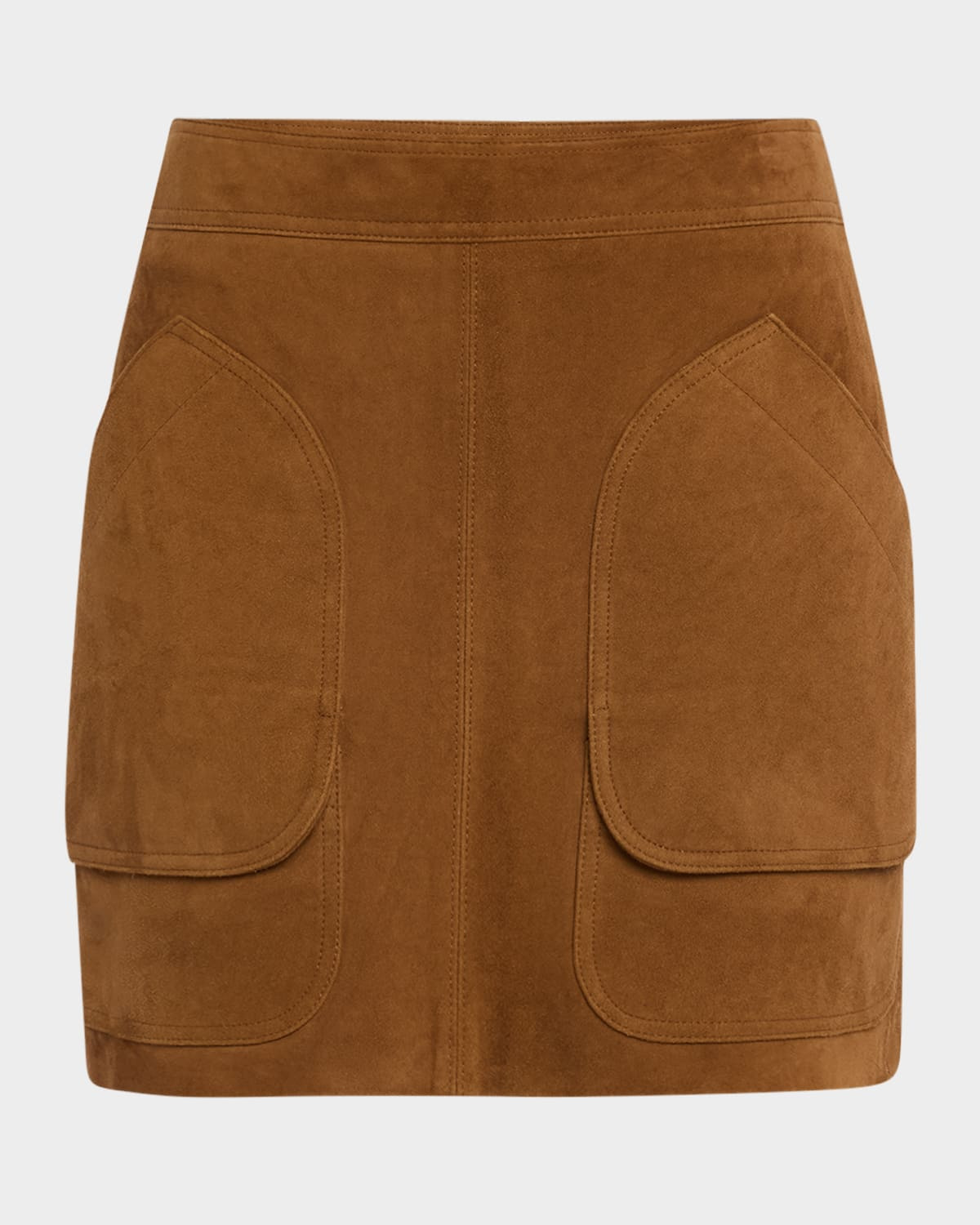 - Veronica Beard "Norwood" suede mini skirt - High rise - Rounded patch pockets - Skirt falls straight from hip to hem - Hem falls above the knee - Center back zip - Leather - Dry clean - Imported