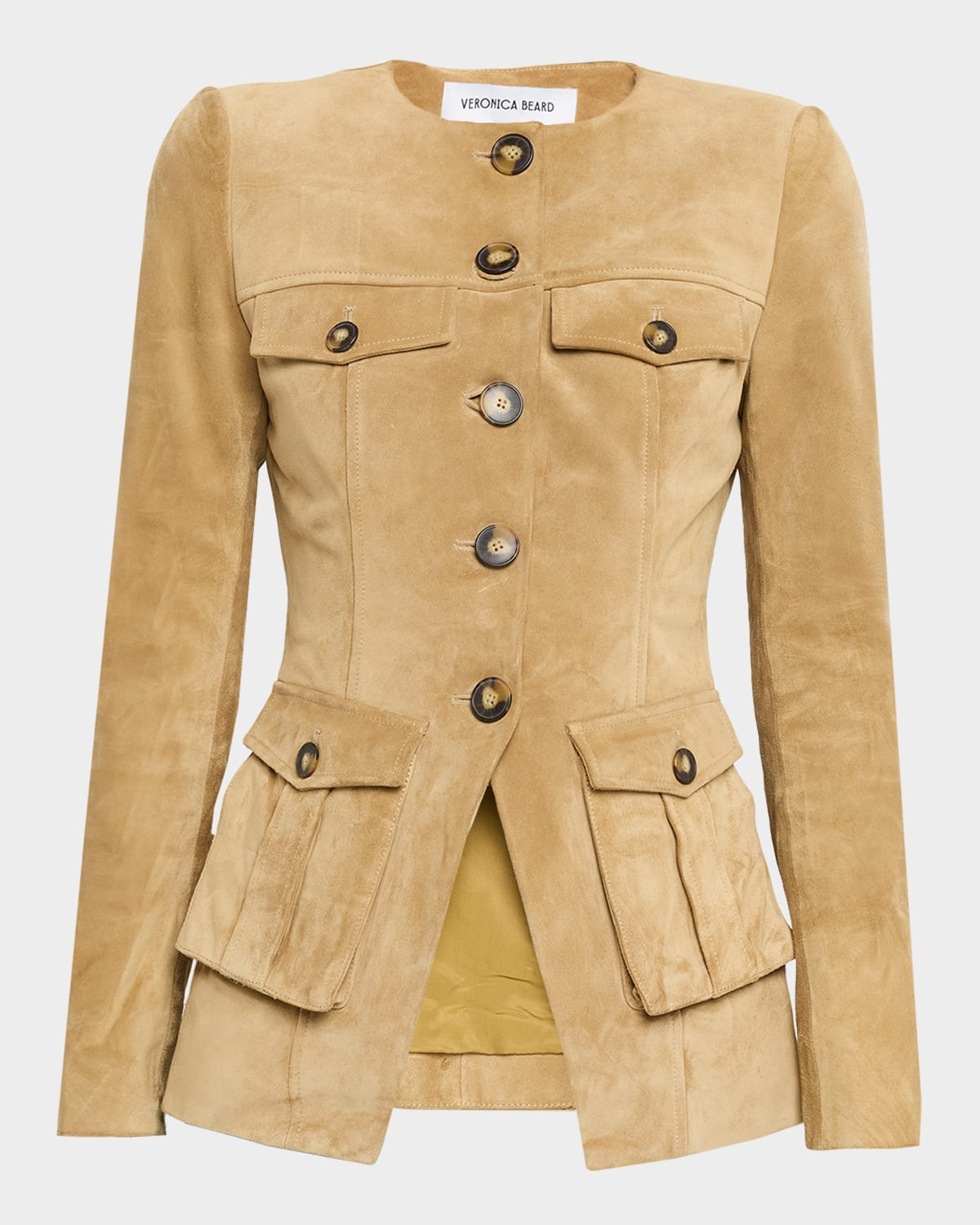 - The "Orrin" jacket by Veronica Beard is crafted of luxurious goat suede and finished with flap pockets for a cargo-inspired look - Round neckline - Single-breasted front - Long sleeves with button cuffs; approx. 32.5"L - Tailored fit - Cut-away hem - Button-front - Leather - Lining: Cupro - Dry clean - Imported