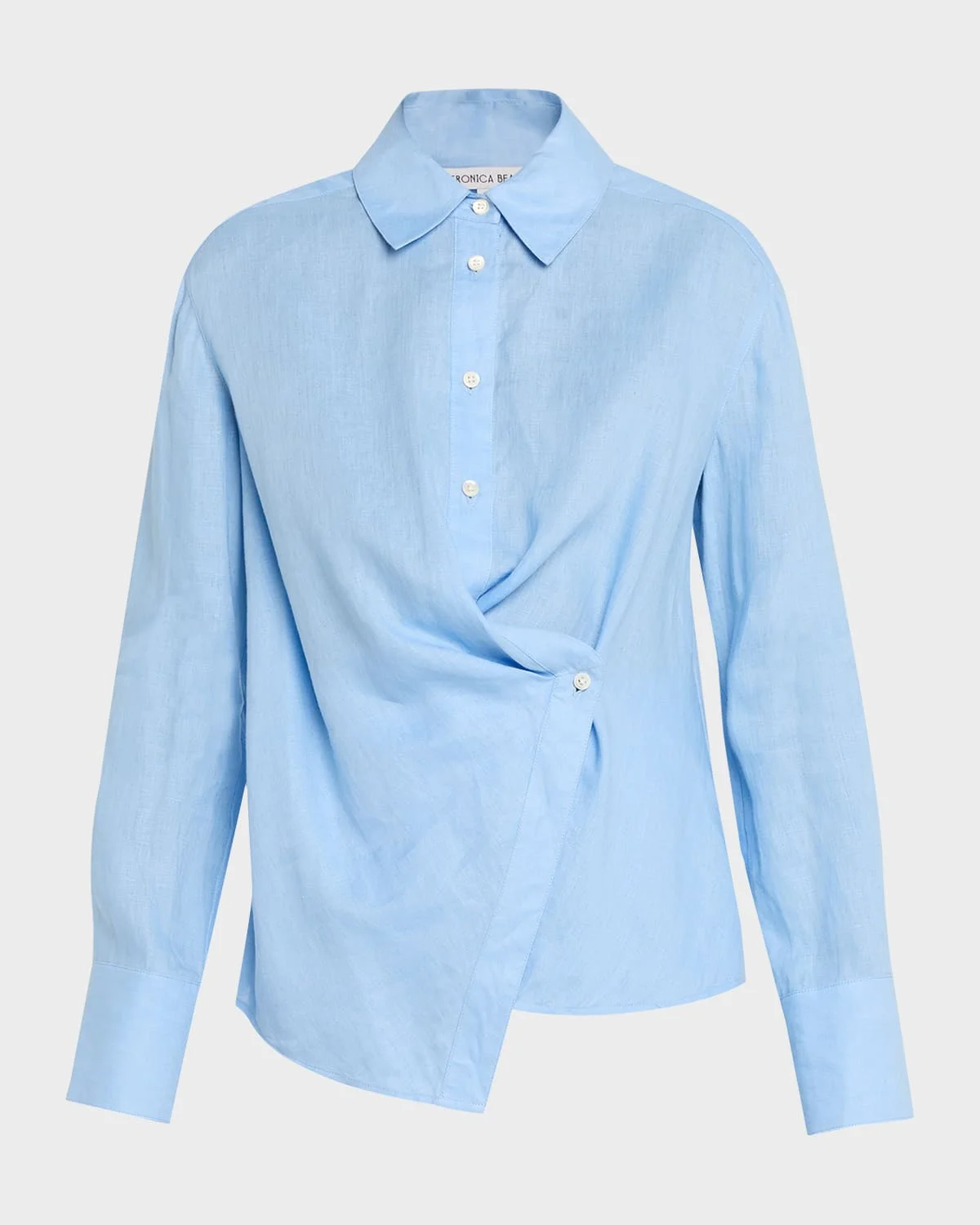 The "Perezzi" shirt by Veronica Beard is crafted from breathable linen and boasts an asymmetric button-front, creating a wrap-like silhouette. Point collar Dropped shoulders Long sleeves with button cuffs Relaxed fit Hem falls to the hip Button-front Linen Dry clean only Imported SIZE & FITModel measurements: 5 & apos;10" tallModel is wearing a US size 4/Small