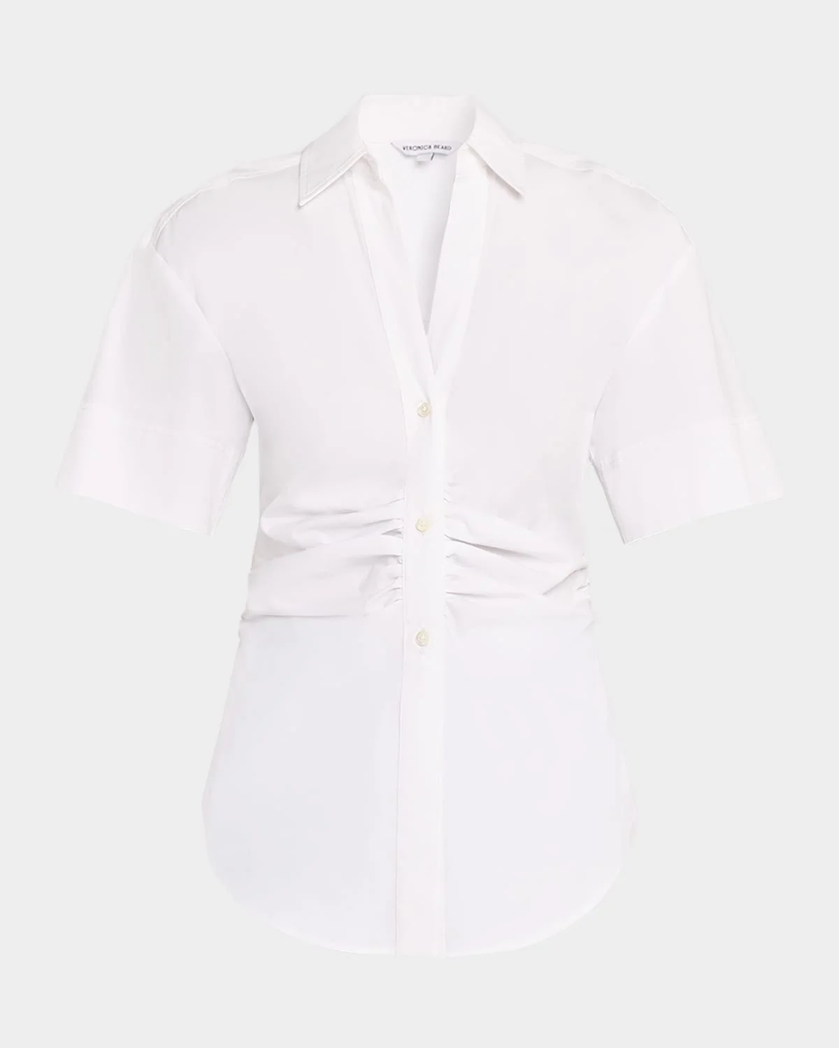 Crafted of stretch cotton, this Veronica Beard shirt is ruched along the waistline to create a slimming effect V neckline with spread collar Three-button front Short sleeves Back yoke Rounded hem Slim fit Cotton/elastane Dry clean Imported