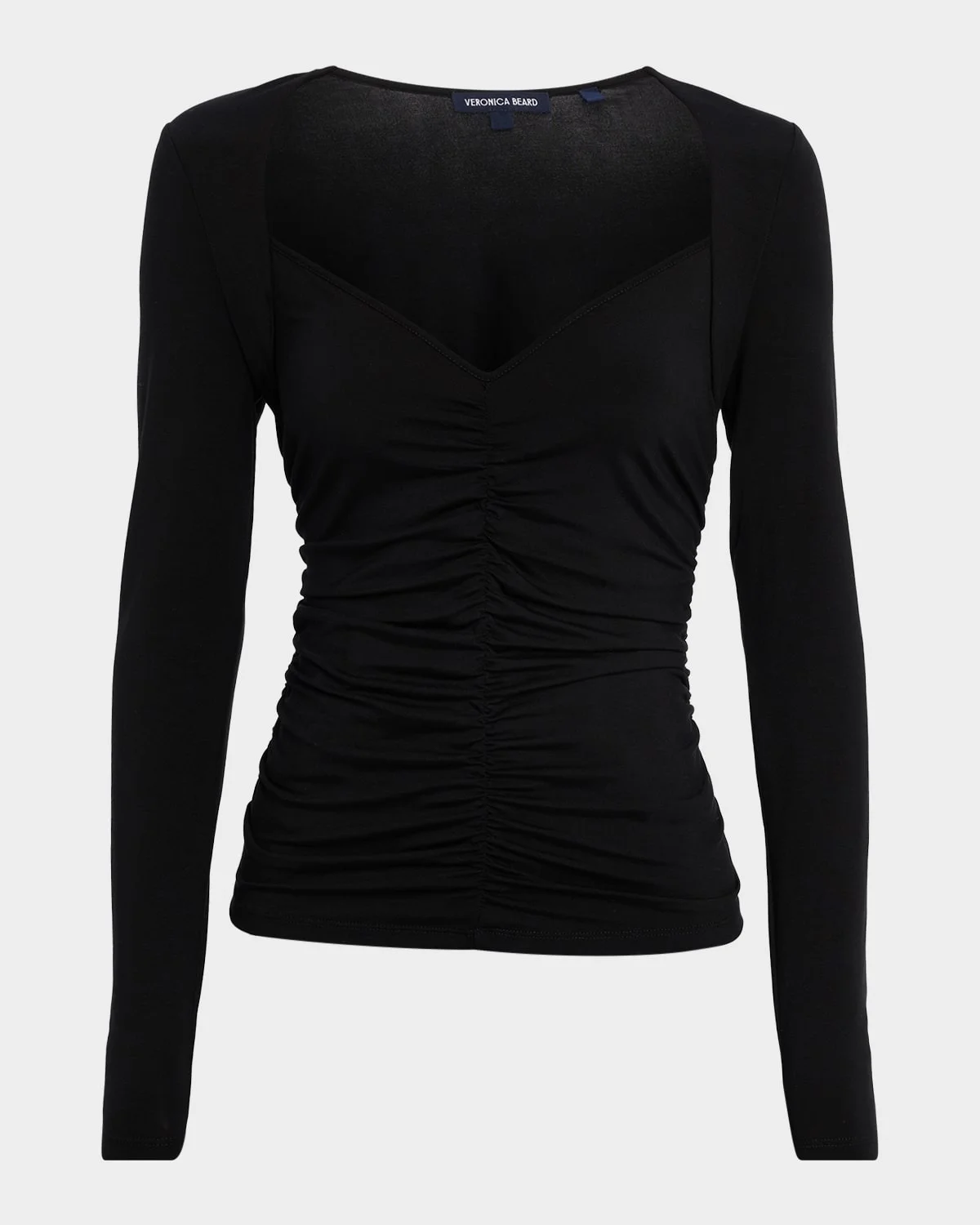 A wardrobe essential, the "Salem" top by Veronica Beard is crafted from jersey in a flattering ruched design Approx. 21.8"L from shoulder to hem V neckline Long sleeves; approx. 31"L Slim fit Hip length Pullover style Lyocell/elastane Unlined Dry clean, machine wash cold Imported