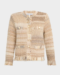 Crafted in a tweedinspired knit, the "Sariyah" jacket by Veronica Beard features a tailored silhouette with fringed trim for an easy, yet polished look. Round neckline Long sleeves Buttoned welt pockets Tailored fit Hem sits at the hip Buttonfront Cotton/acrylic/polyester Dry clean Made in Italy