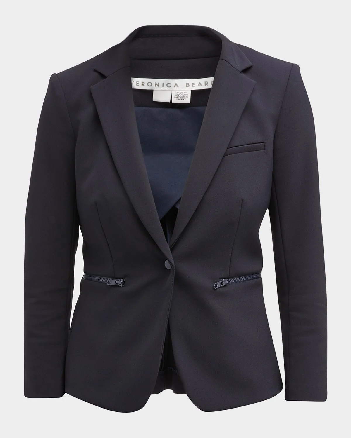Veronica Beard "Scuba Schoolboy" blazer Approx. 23.3"L down center back. Notched collar; onesnap front. Threequarter sleeves. Zip and welt pockets Tailored fit Cutaway hem Nylon/spandex. Dry clean. Made in USA of imported material.