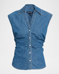 - Crafted from medium-wash denim, the "Sera" top by Veronica Beard features distinctive ruched - gathering - at the waistline, creating a figure-enhancing shape - Approx. 24.1"L from shoulder to hem - Collared V neckline - Sleeveless - Yoked back - Slim fit - Hip length - Snap front closure - Cotton - Machine wash cold, wash inside out - Imported