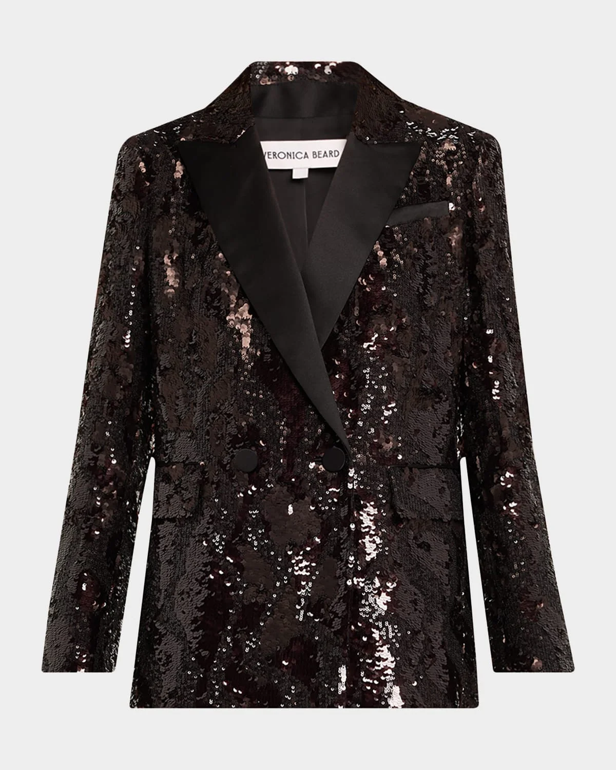 Elegance and glamour meet in the "Sevyn" jacket by Veronica Beard, featuring sequin embellishment and satin trim. Peak lapels Doublebreasted front Structured shoulders Long sleeves with button cuffs; approx. 32.5"L Chest welt pocket Hip flap pockets Tailored fit Vented back Buttonfront Polyester/elastane Lining: Polyester/elastane Spot clean Imported