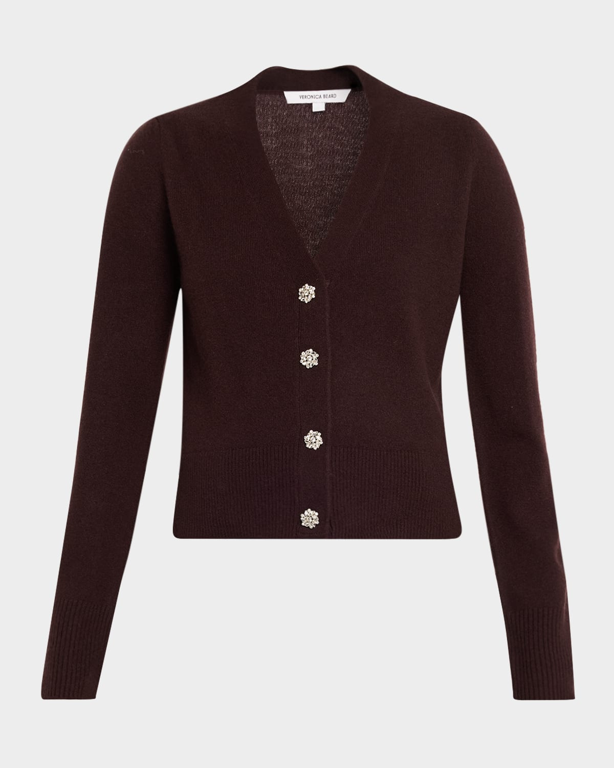 Crafted from luxurious cashmere in a rich burgundy hue, the "Solene" cardigan by Veronica Beard is finished with crystal buttons for a touch of glamour. V neckline Long sleeves with ribbed cuffs; approx. 30.5"L Classic fit Ribbed hem Buttonfront Cashmere Unlined Dry clean Imported