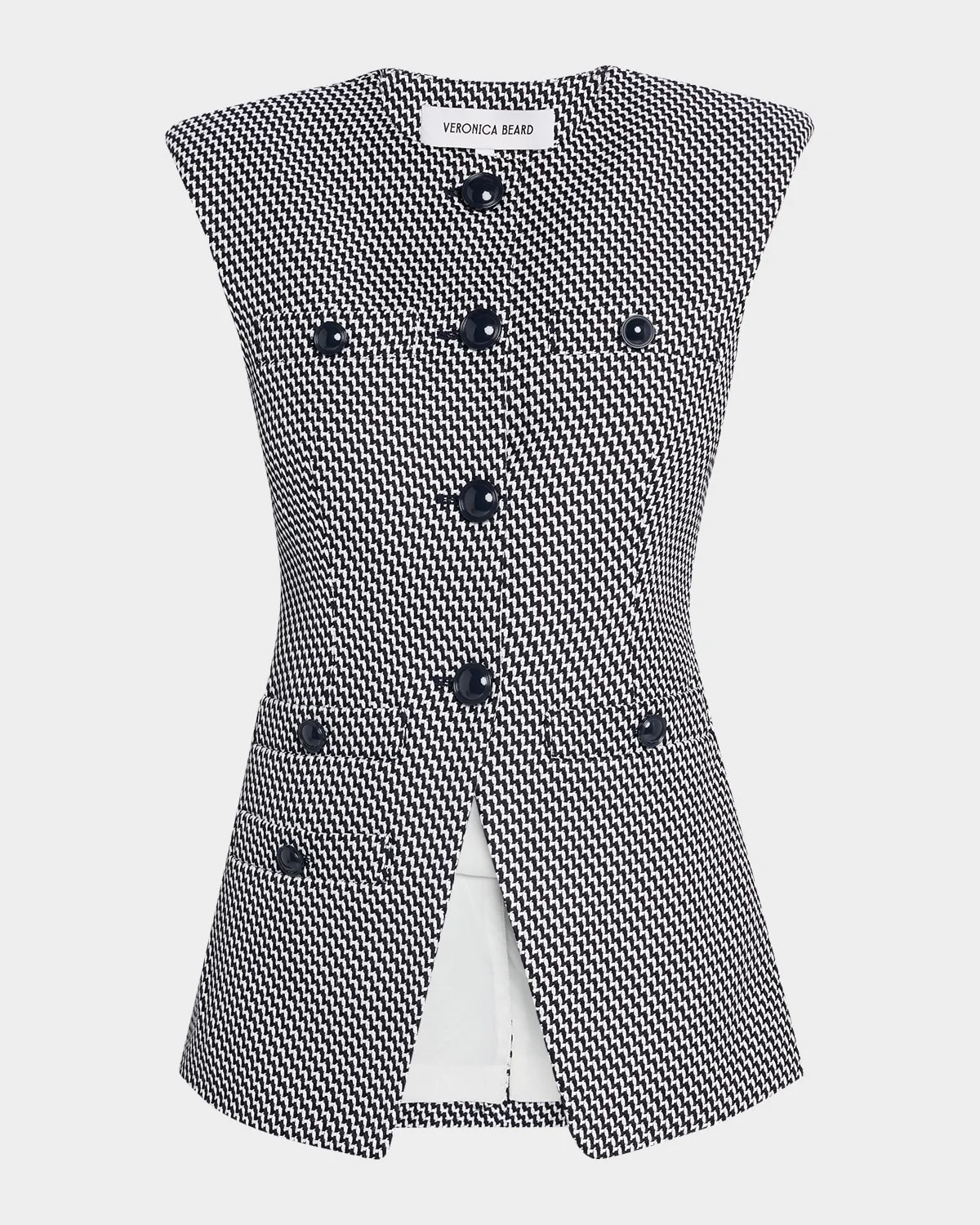 The "Tamara" vest by Veronica Beard is expertly tailored from stretch cotton and defined by an angular cutaway hem and bold crest buttons Collarless neckline Padded shoulders Sleeveless Four buttoned welt pockets Tailored fit Midlength Button front closure Cotton/polyester/elastane Dry clean Imported