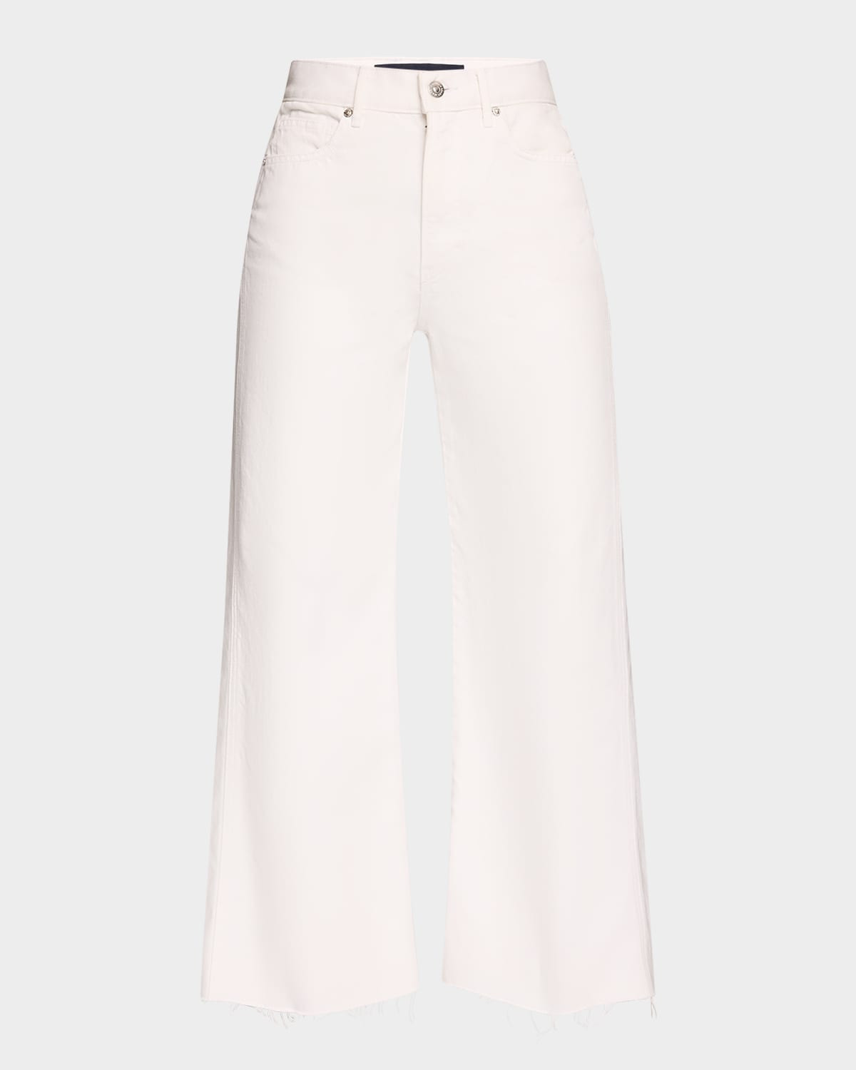 Veronica Beard "Taylor" jeans featuring a raw hem in white denim Approx. 12" rise; 27" inseam High rise Fivepocket style Wide legs Cropped length Button/zip fly; belt loops Cotton Machine wash cold Made in USA from imported materials