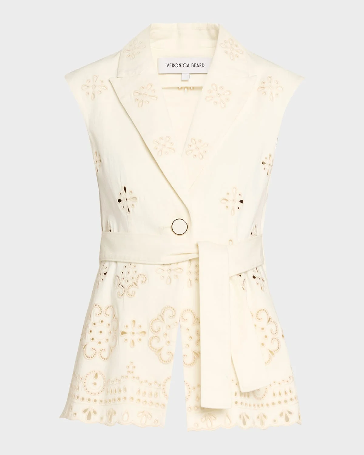 Part of the Veronica Beard x CFDA Creative Futures Scholarship initiative, this design showcases the work of an emerging talent mentored at Veronica Beard. Accented with intricate eyelet embroidery, the "Townes" vest by Veronica Beard is crafted from crisp cotton twill and finished with delicate scalloped trim, creating a chic silhouette perfect for spring-to-summer styling. Peak lapels Single-breasted front Sleeveless Self-tie belt Slim fit Cut-away hem Button-front & nbsp; Cotton/elastane Lining: Polyester Dry clean only & nbsp; Imported SIZE & FITModel measurements: 5 & apos;10" tallModel is wearing a US size 4/Small