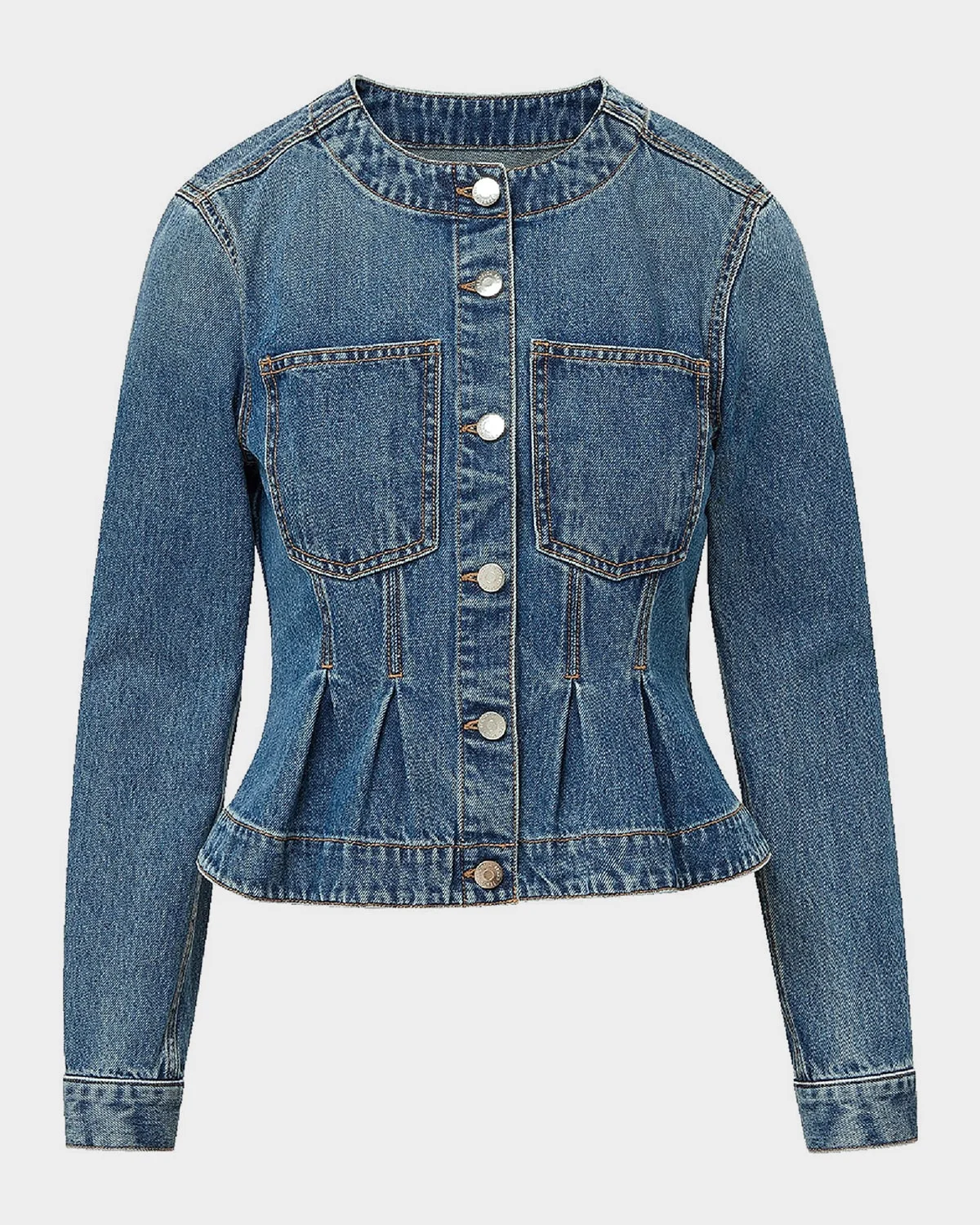 Crafted from premium denim, the "Zahara" jacket by Veronica Beard is finished with a peplum hem for a modern, feminine touch. Crew neckline Long sleeves with button cuffs; approx. 32.5"L Dual chest pockets Classic fit Hem sits at the hip Buttonfront Cotton Machine wash cold Imported
