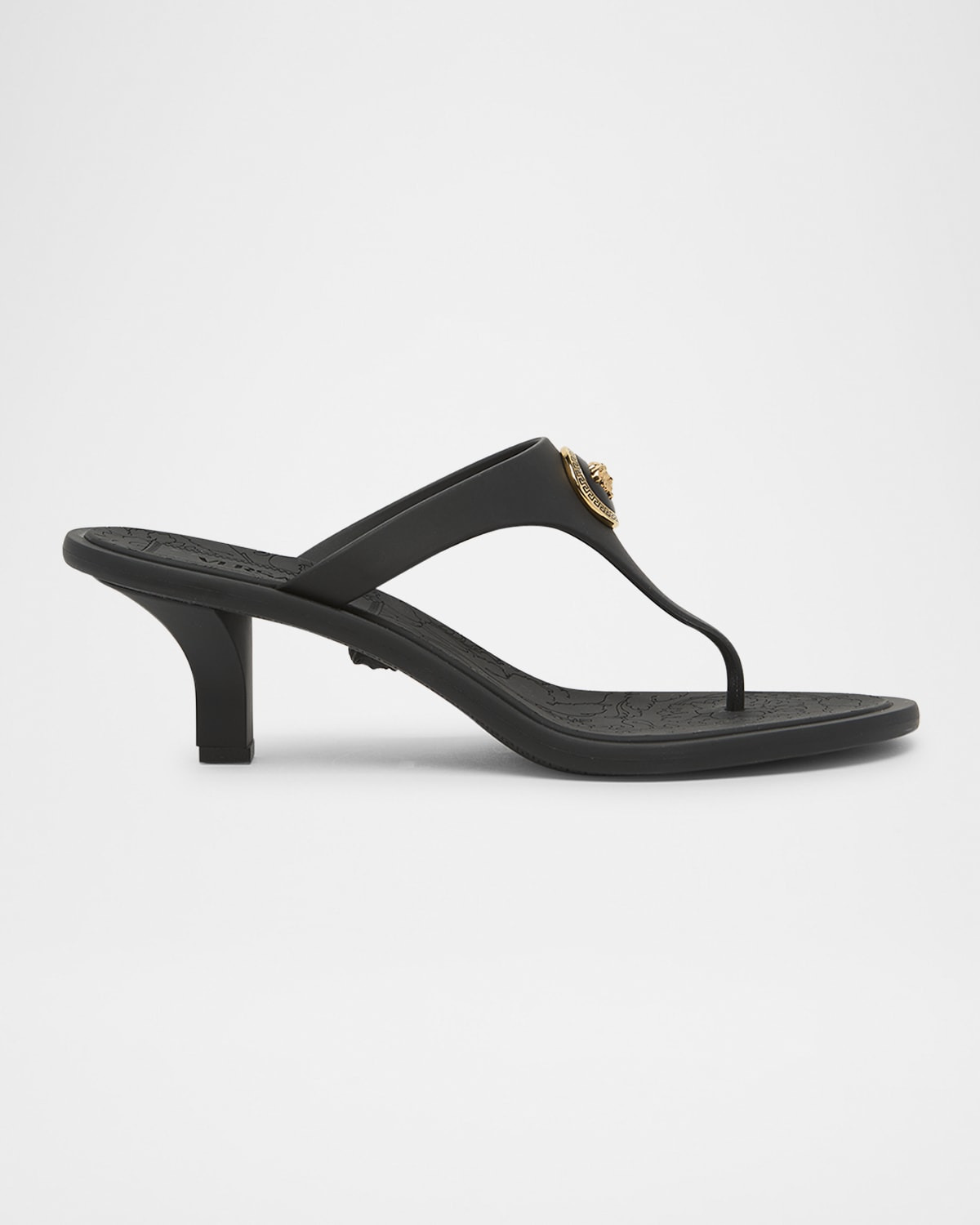 - Versace "Alia" rubber sandals with signature Medusa hardware - 2.25 in / 55 mm kitten heel - Open toe - Thong strap - Slide style - Rubber outsole - Spot clean - Imported