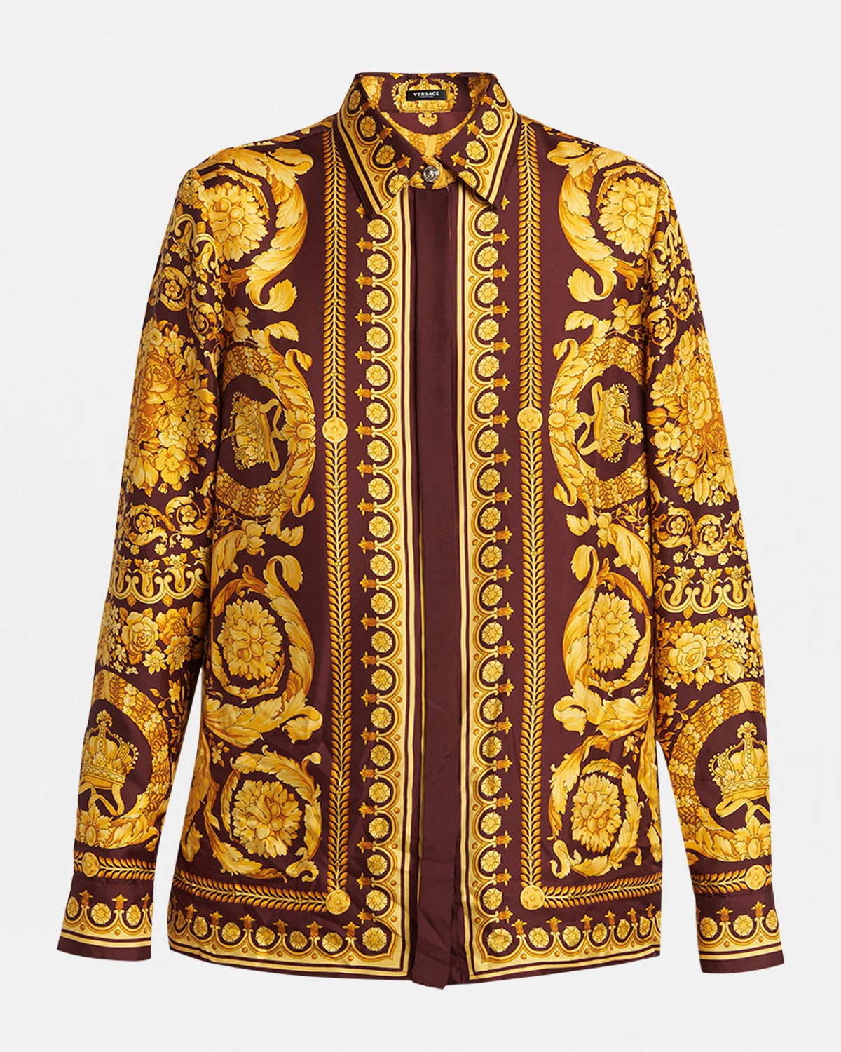 Crafted from luxurious silk, this Versace shirt boasts an allover Barocco print and signature Medusa buttons. Spread collar Long sleeves with button cuffs Classic fit Hem falls to the hip Hidden buttonfront Silk Dry clean Made in Italy