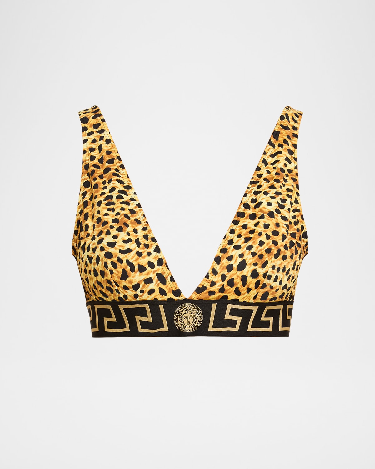 Featuring a bold, allover cheetah print, this bikini top by Versace is finished with the signature Greca border and Medusa motif on the elasticbanded hem V neckline Tall triangle cups Pullover style Nylon/polyamide/elastane Lining: Elastane/nylon Made in Italy Bottoms sold separately