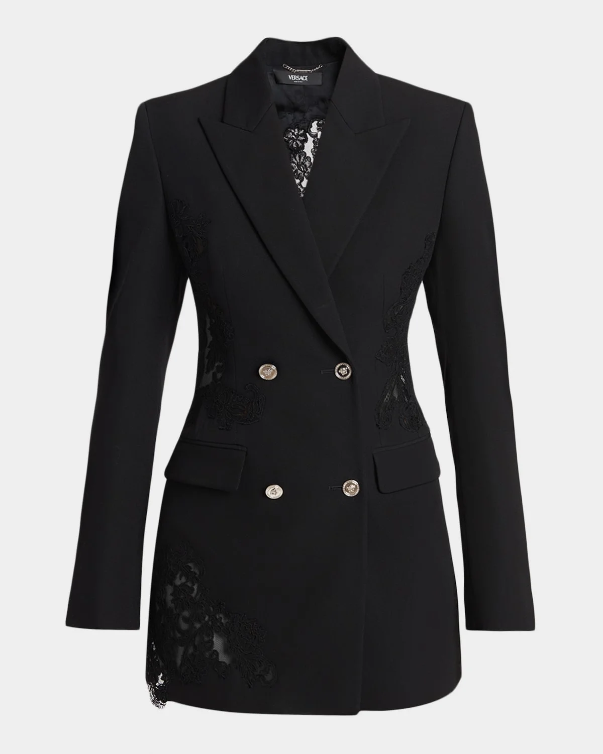 Finished with sheer lace panels, this Versace jacket dress is crafted from a tailored wool-blend and boasts a double-breasted front with signature Medusa hardware throughout. Wide peak lapels & nbsp; Structured shoulders Long sleeves with button cuffs Hip flap pockets Tailored silhouette Hem falls above the knee Button-front & nbsp; Virgin wool/silk/polyester Dry clean only & nbsp; Made in Italy