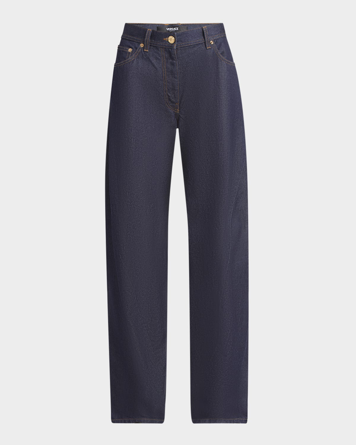 - Versace indaco soft dark wash denim pants with signature goldtone Medusa button, back V belt loops, and a leather logo patch on the back of waist - High rise - Five-pocket style - Barrel legs - Full length - Button/zip fly; belt loops - Cotton/leather - Dry clean - Made in Italy