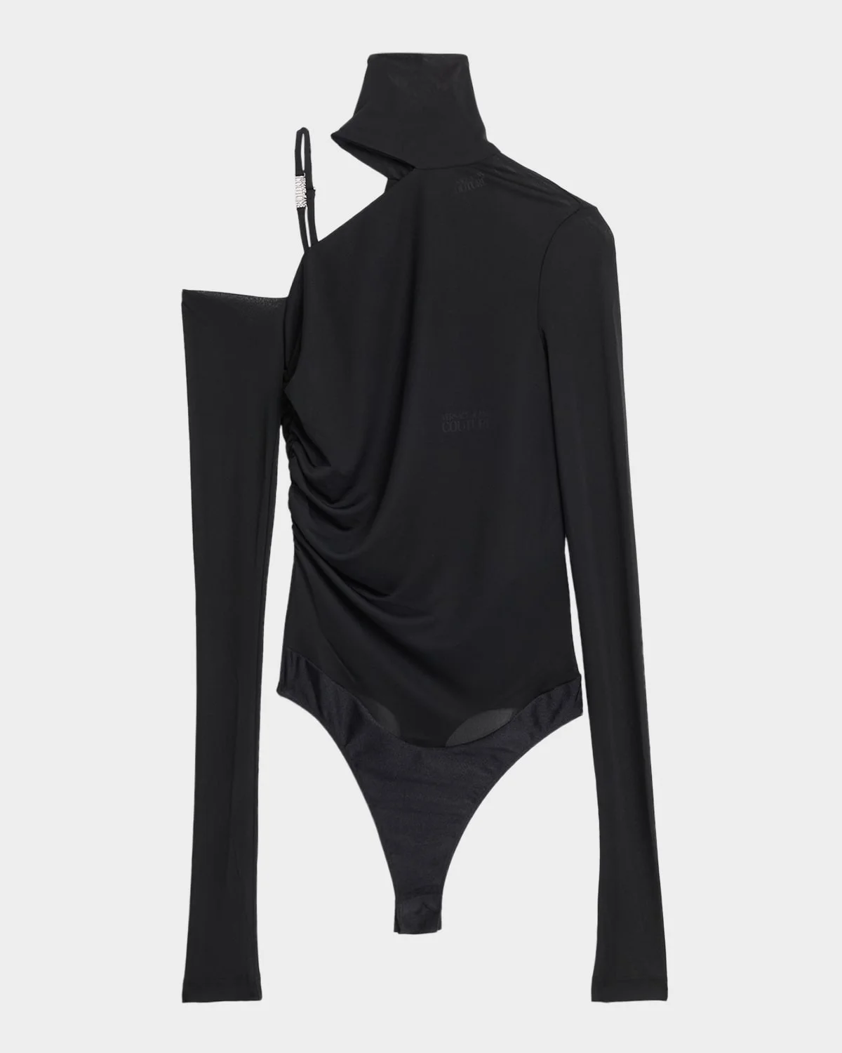 Draped in a soft jersey mesh with ruching, this Versace Jeans Couture bodysuit features a cutout detail adorned with logo hardware. Turtleneck Long sleeves Slim fit Snapgusset closure Polyester Unlined Hand wash or dry clean Imported