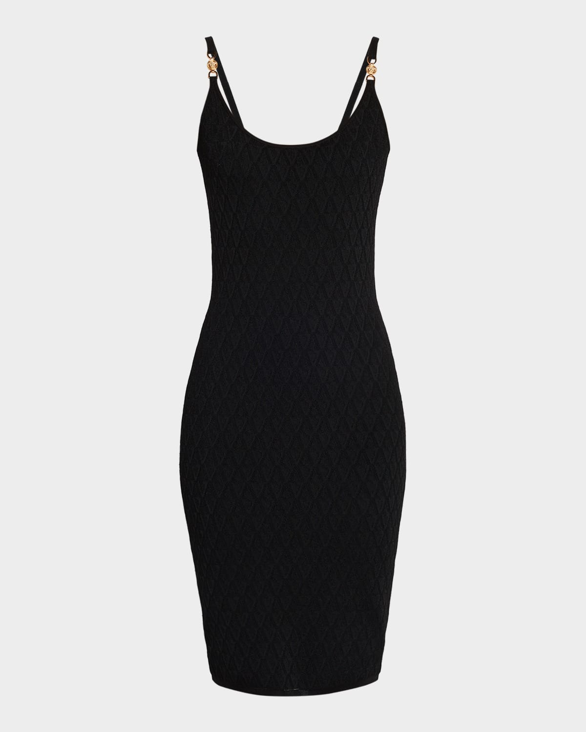 Featuring a tonal knit jacquard V allover pattern, this Versace midi dress is adorned with signature goldtone Medusa '95 hardware for a touch of glamour. Scoop neckline Sleeveless Bodycon silhouette Hem hits around the knee Slipover style Viscose/nylon/polyamide/elastane Dry clean Made in Italy