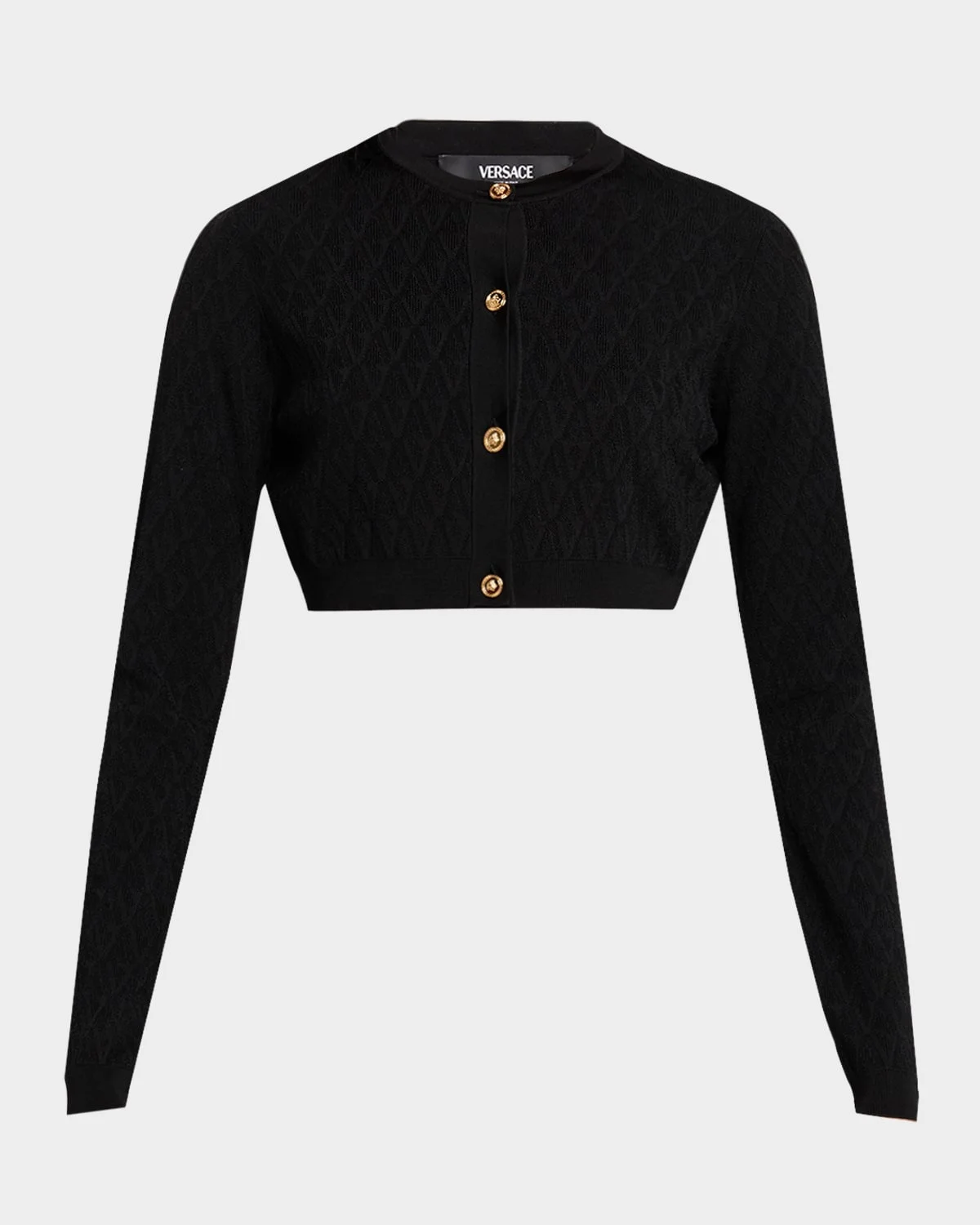 Featuring a tonal knit jacquard V allover pattern, this cropped cardigan by Versace is adorned with signature goldtone Medusa buttons for a touch of glamour. Crew neckline Long sleeves Cropped fit Buttonfront Viscose/nylon/polyamide/elastane Dry clean Made in Italy