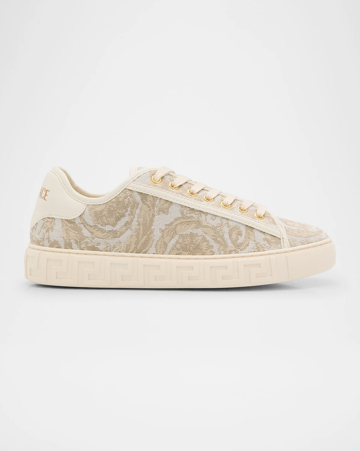 - Versace low-top sneakers in Greca embroidered cotton - 0.75 in / 20 mm flat heel - Greca-embossed midsole - Round toe - Lace-up vamp - Leather backstay with gold-tone logo - Cushioned footbed - Lining: Polyester - Lightweight, sturdy TPU outsole - Spot clean - Made in Italy